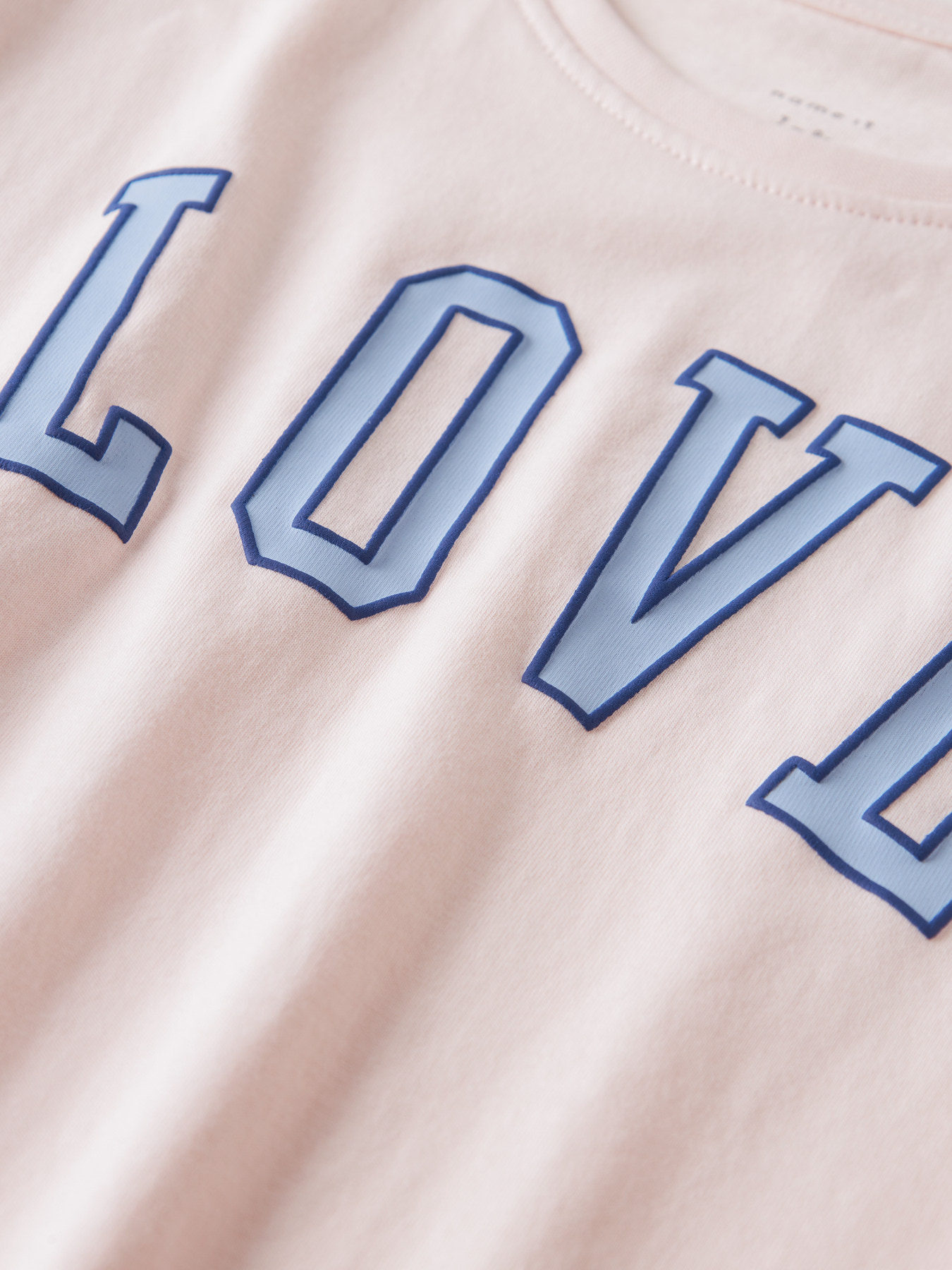 Super fed t-shirt fra name it. Den har rund hals og er rosa med Love tekst på.