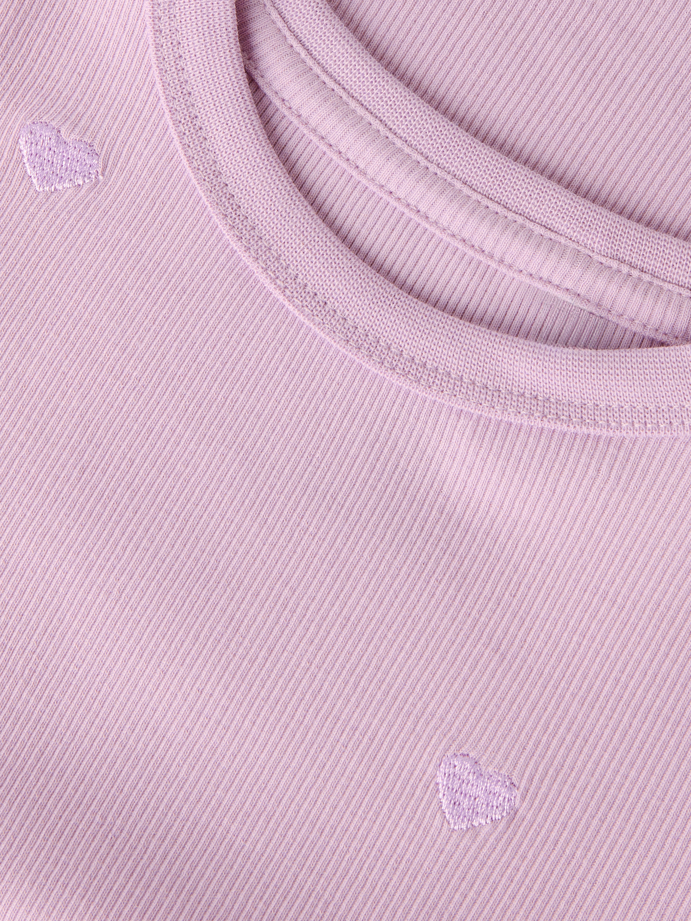 Den bløde ribstrik giver en behagelig elasticitet og et tidløst udtryk, mens den runde hals og korte ærmer gør den let at style. Fine broderidetaljer tilføjer et sødt touch, og den slim fit pasform sikrer et pænt og komfortabelt look hele dagen.