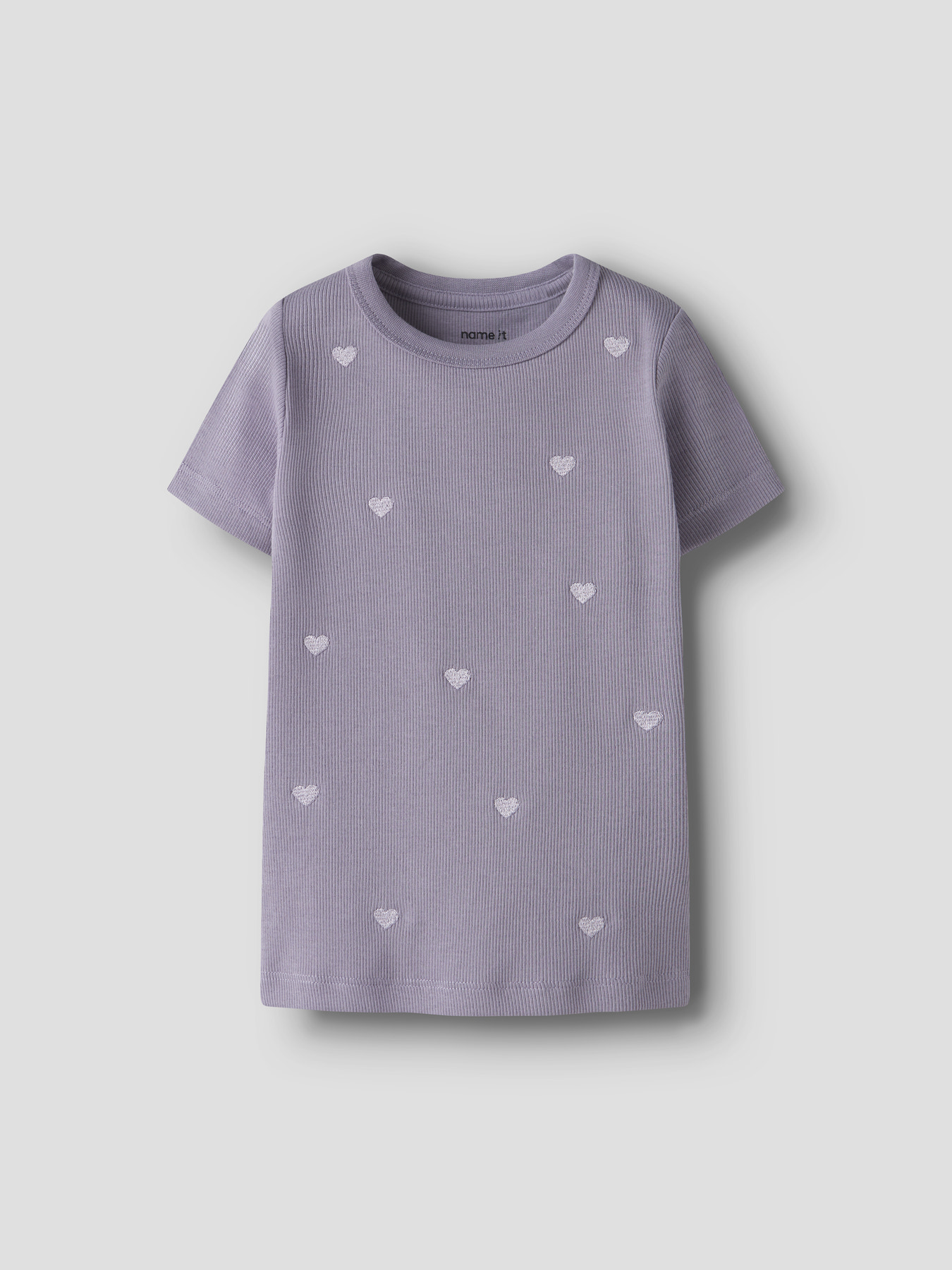 Den bløde ribstrik giver en behagelig elasticitet og et tidløst udtryk, mens den runde hals og korte ærmer gør den let at style. Fine broderidetaljer tilføjer et sødt touch, og den slim fit pasform sikrer et pænt og komfortabelt look hele dagen.