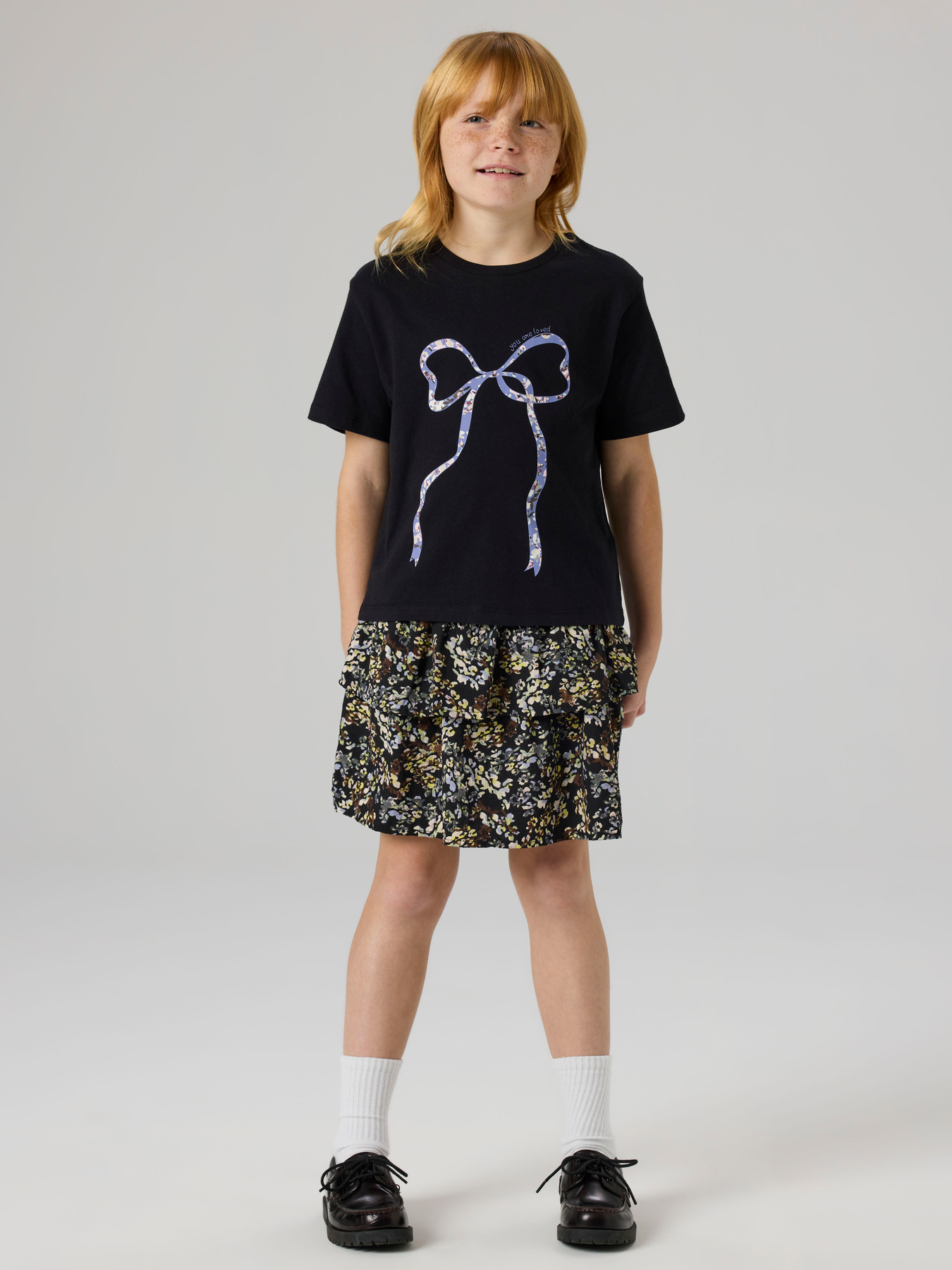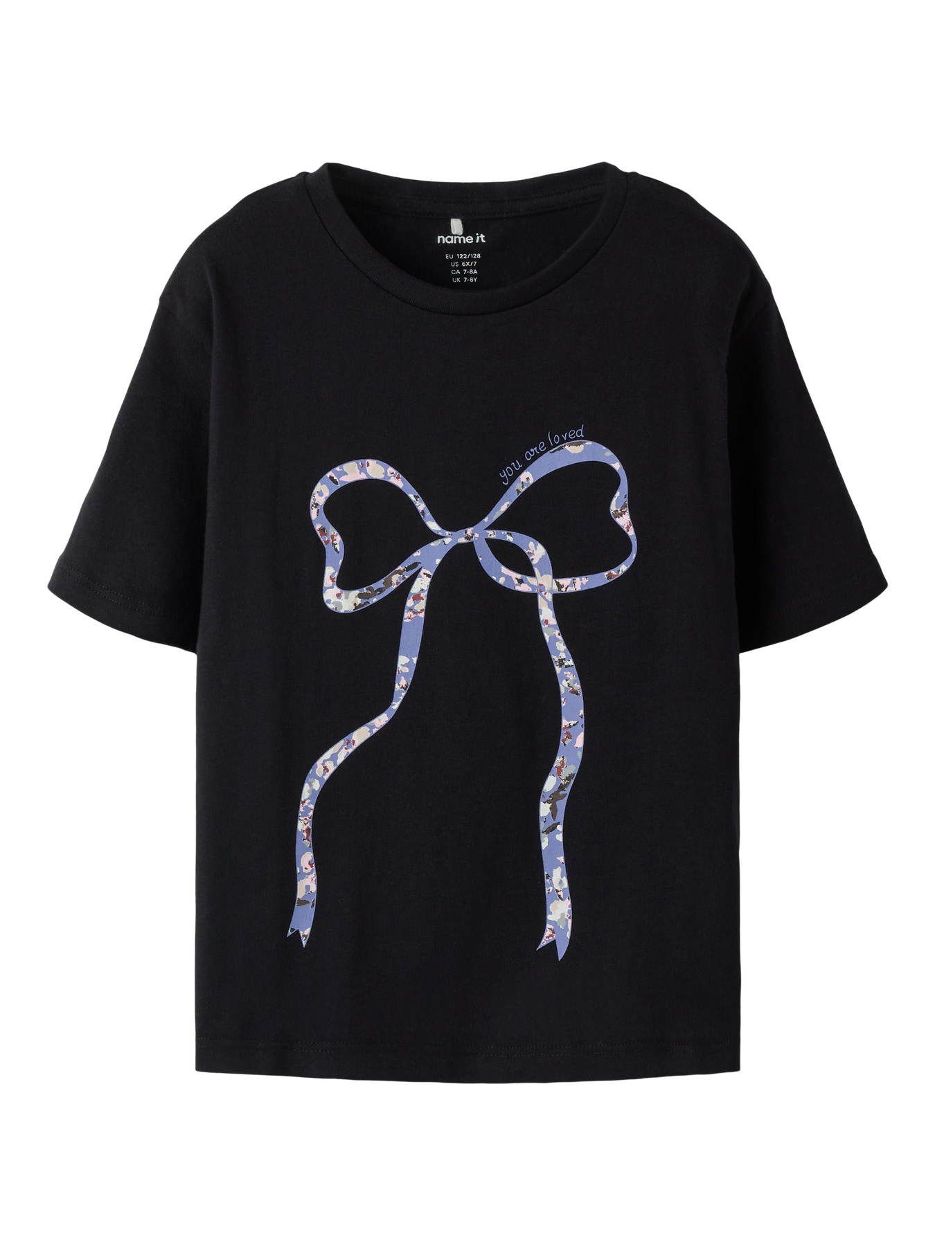 Super smuk kortærmet t-shirt fra Name it. Den er i klassisk sort og med stort printet sløjfe tryk på maven. Den er i lækker blød kvalitet.