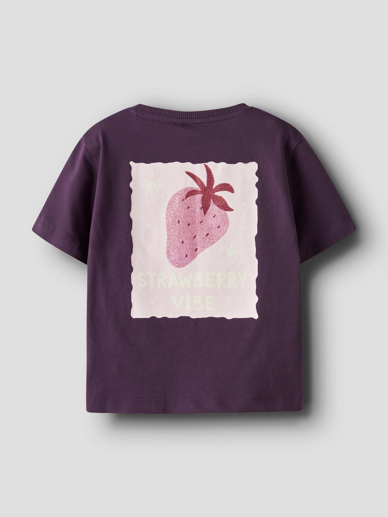 En yndig t-shirt fra Name it med et stort jordbær på ryggen og et lille på brystet - begge med fine glitter detaljer på. T-shirten er i regular fit og er dejligt blød.