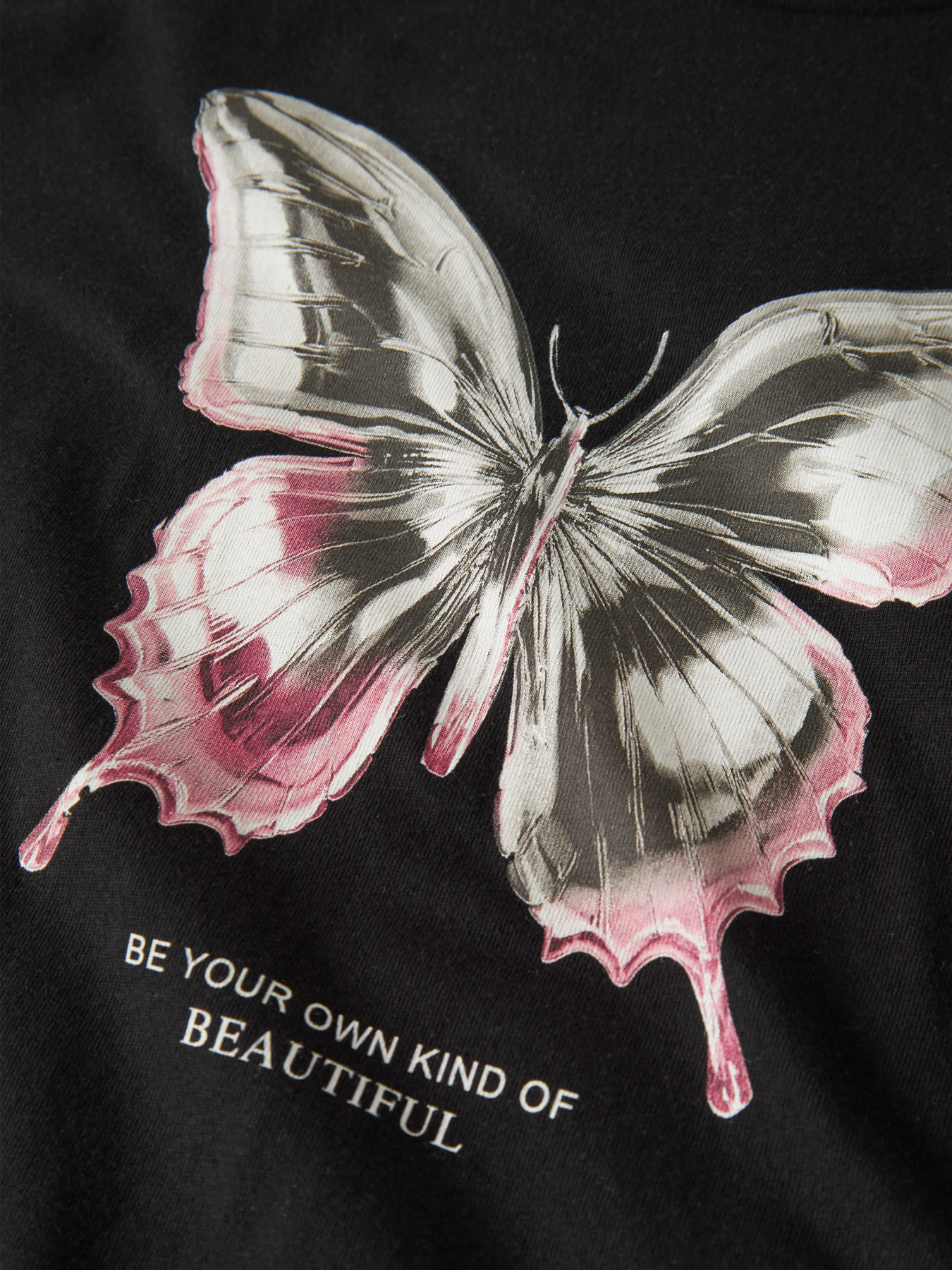 Super cool t-shirt fra Name it. Den er sort og med stort sommerfugle tryk på maven i fede farver.