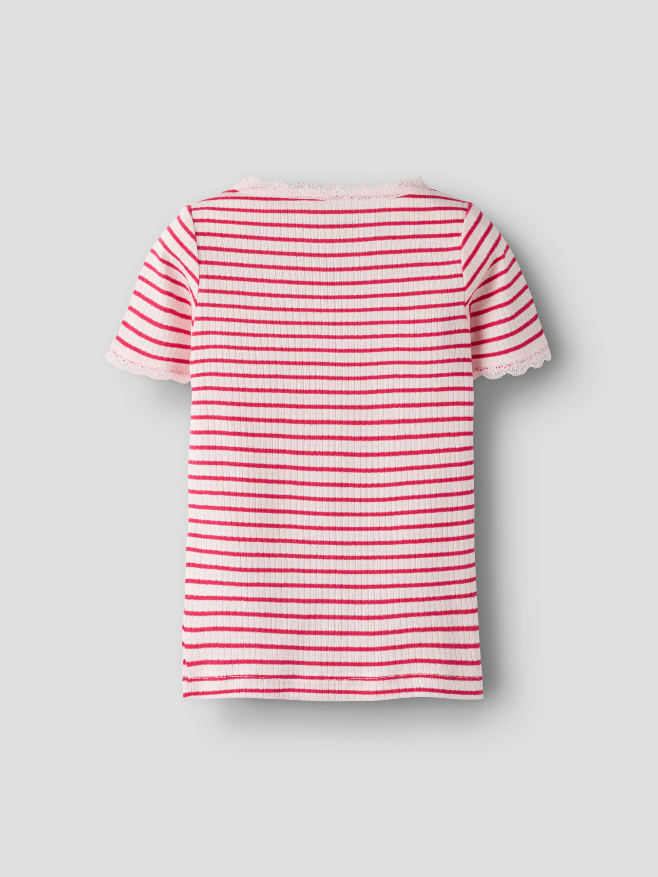 Stilfuld T-shirt, perfekt til både hverdag og særlige lejligheder. Den ribstrikkede kvalitet med lodret struktur giver et tidløst look og god elasticitet for optimal komfort. T-shirten har rund hals, korte ærmer, fine blondedetaljer og en tætsiddende pasform, der giver et moderne og elegant udtryk.