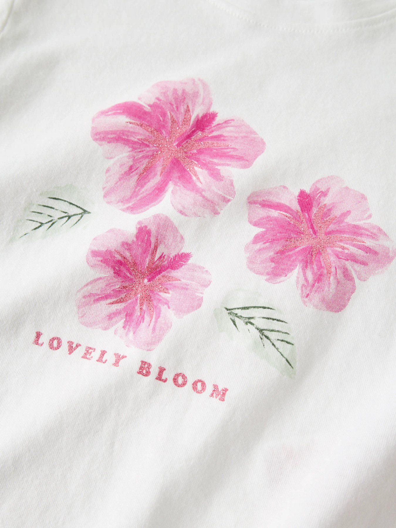 T-shirt, perfekt til både hverdag og særlige lejligheder. Det lette og strækbare jersey-materiale giver en blød fornemmelse og fri bevægelighed, mens det detaljerede frontprint med glitter og fotoeffekt tilføjer et sejt og iøjnefaldende look.