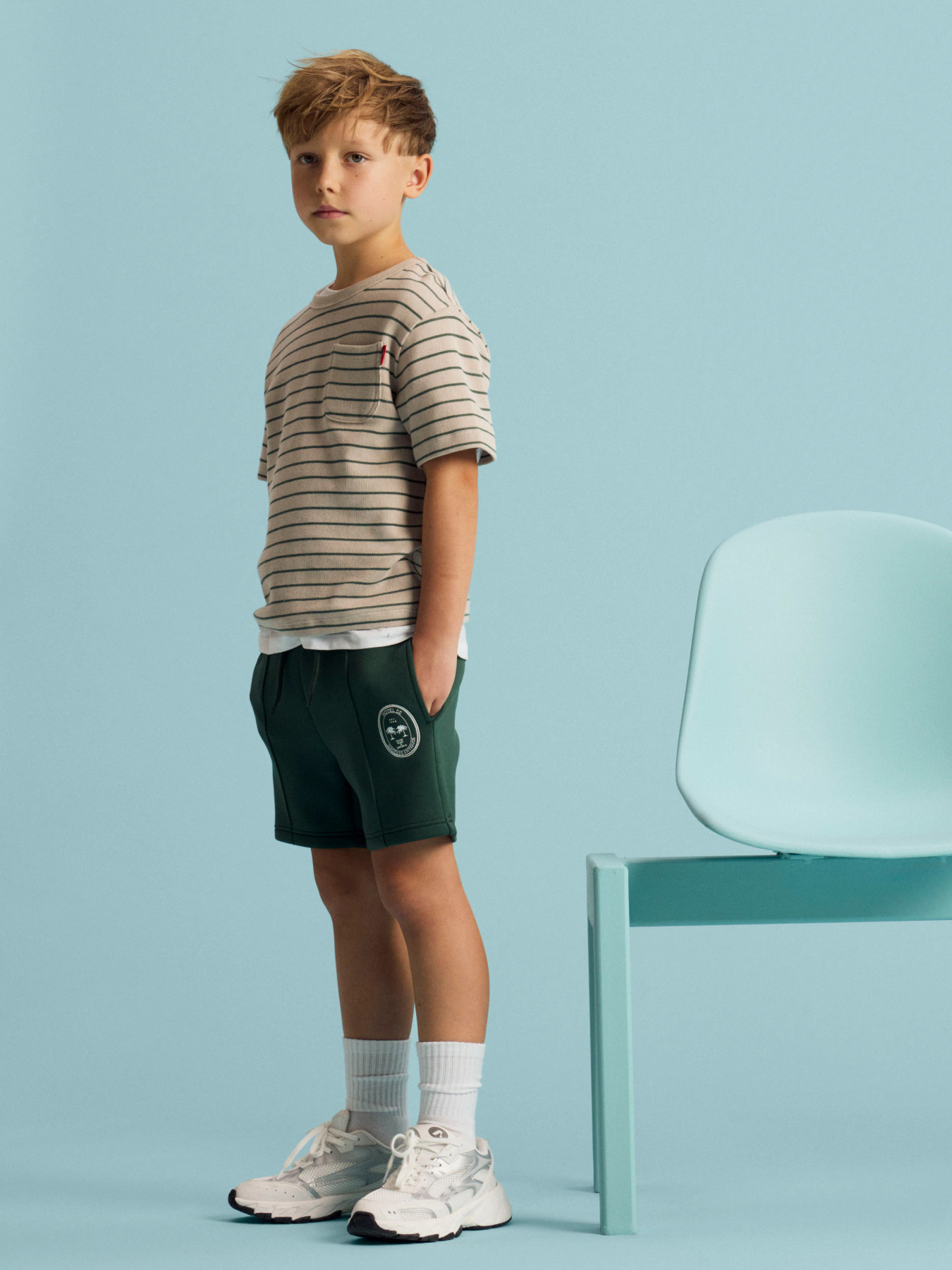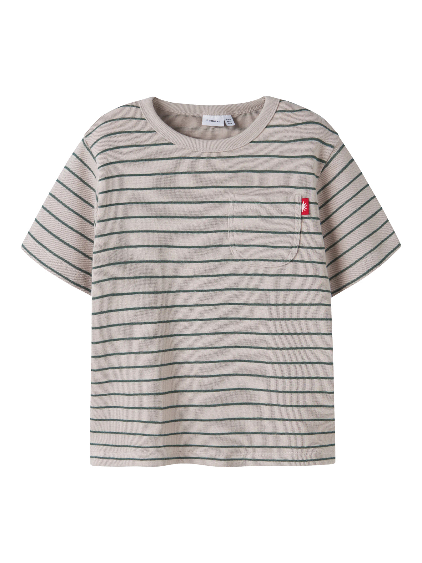 T-shirten er lavet i ribstrikket stof med vertikale striber, som giver god elasticitet og komfort. Den har rund hals, korte ærmer, en brystlomme, en diskret label detalje og en regular fit, der sikrer et tidløst og afslappet look.