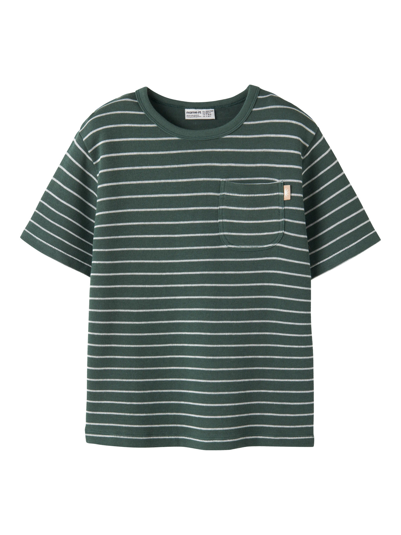 T-shirten er lavet i ribstrikket stof med vertikale striber, som giver god elasticitet og komfort. Den har rund hals, korte ærmer, en brystlomme, en diskret label detalje og en regular fit, der sikrer et tidløst og afslappet look.