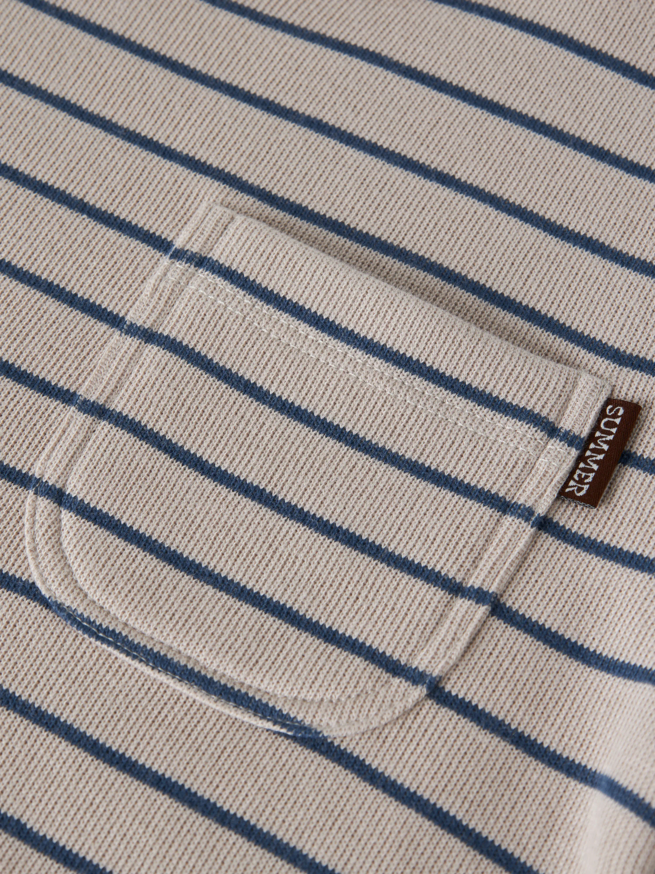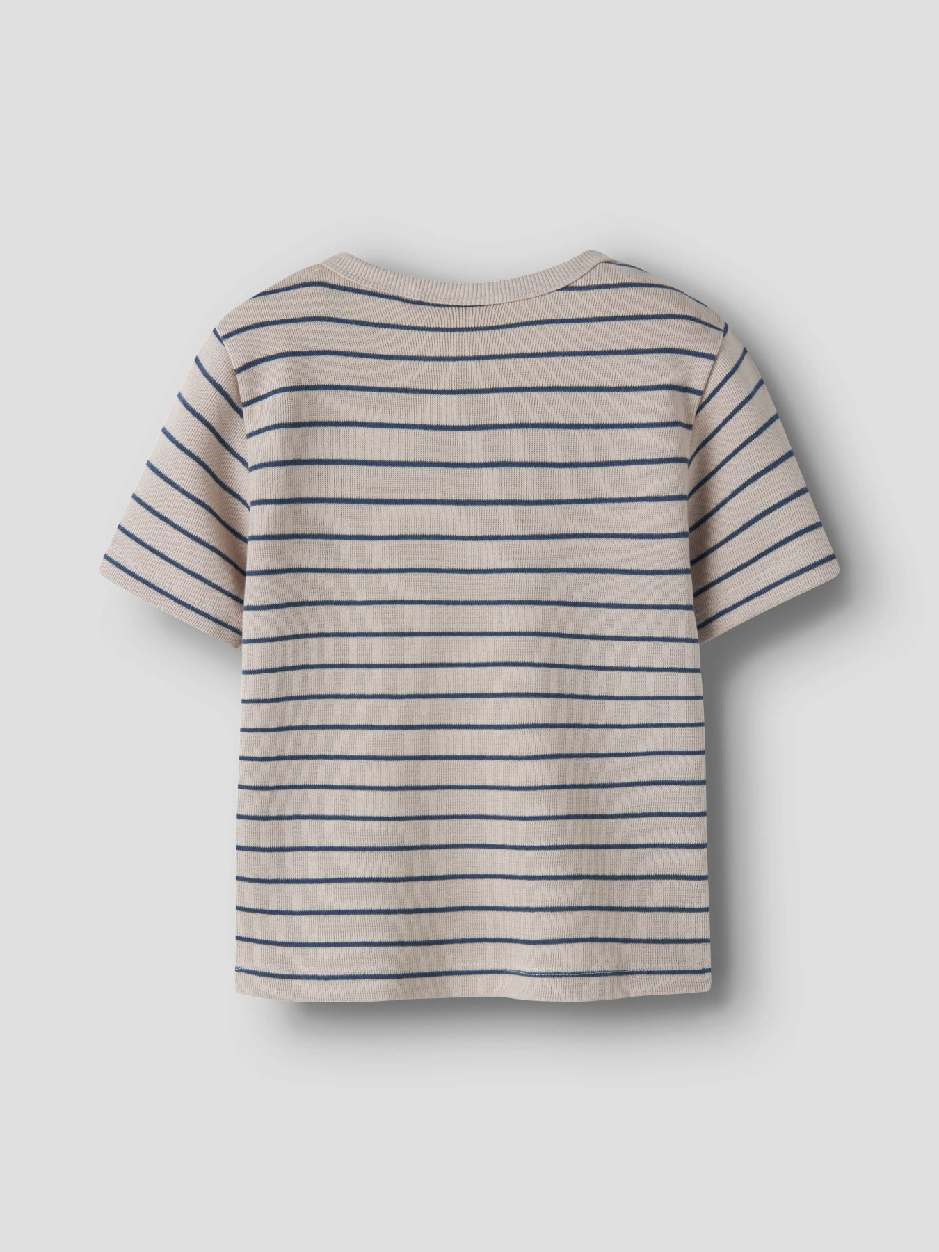 Opdater dit barns garderobe med en stilfuld og alsidig t-shirt, perfekt til både hverdag og særlige lejligheder. Det ribstrikkede materiale med lodret stribet mønster giver et tidløst look og god komfort.