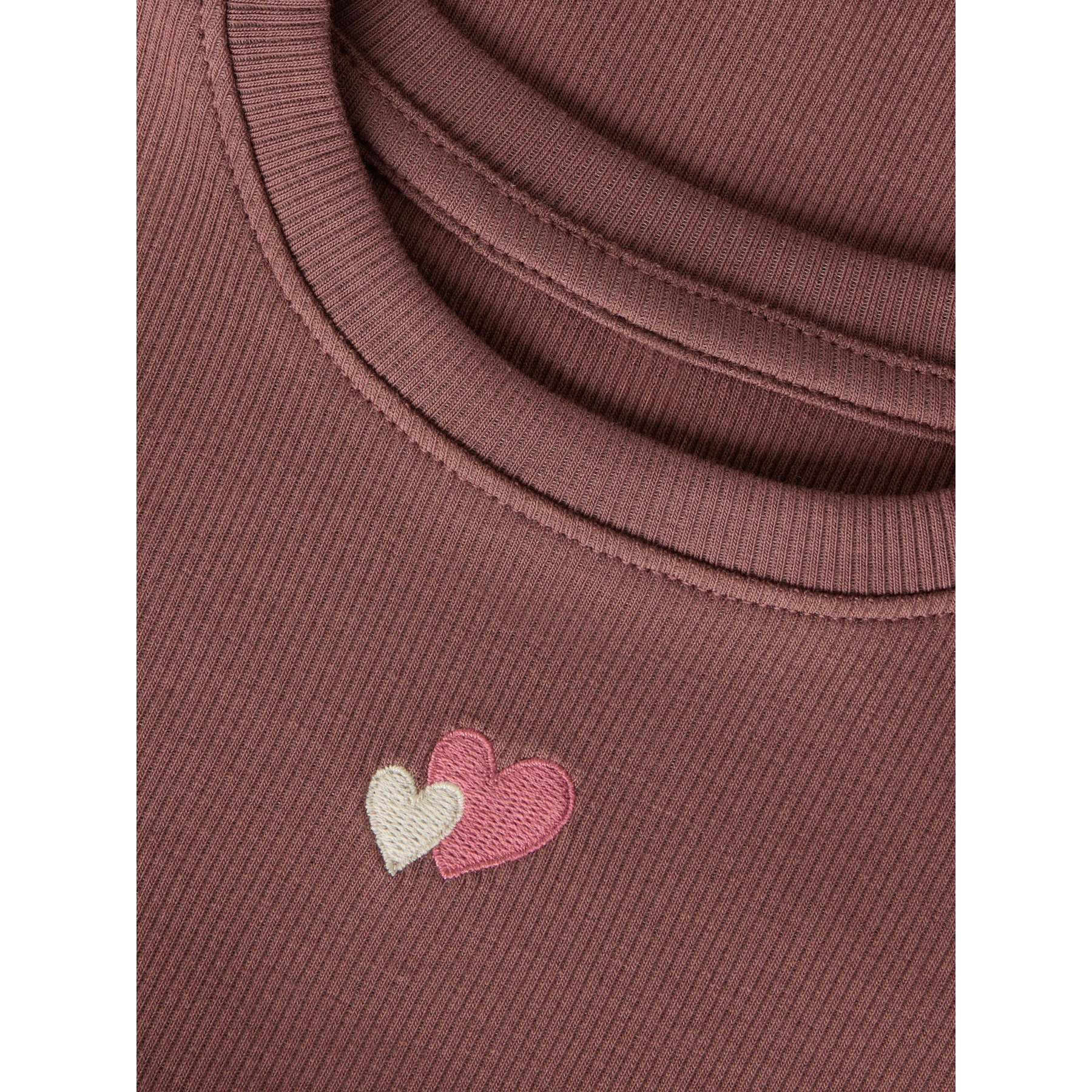 En ribstrikket top med korte ærmer og bølgede kanter, samt et fint hjerteprint på brystet. Den bløde ribkvalitet giver en behagelig og fleksibel pasform til hverdagsbrug.