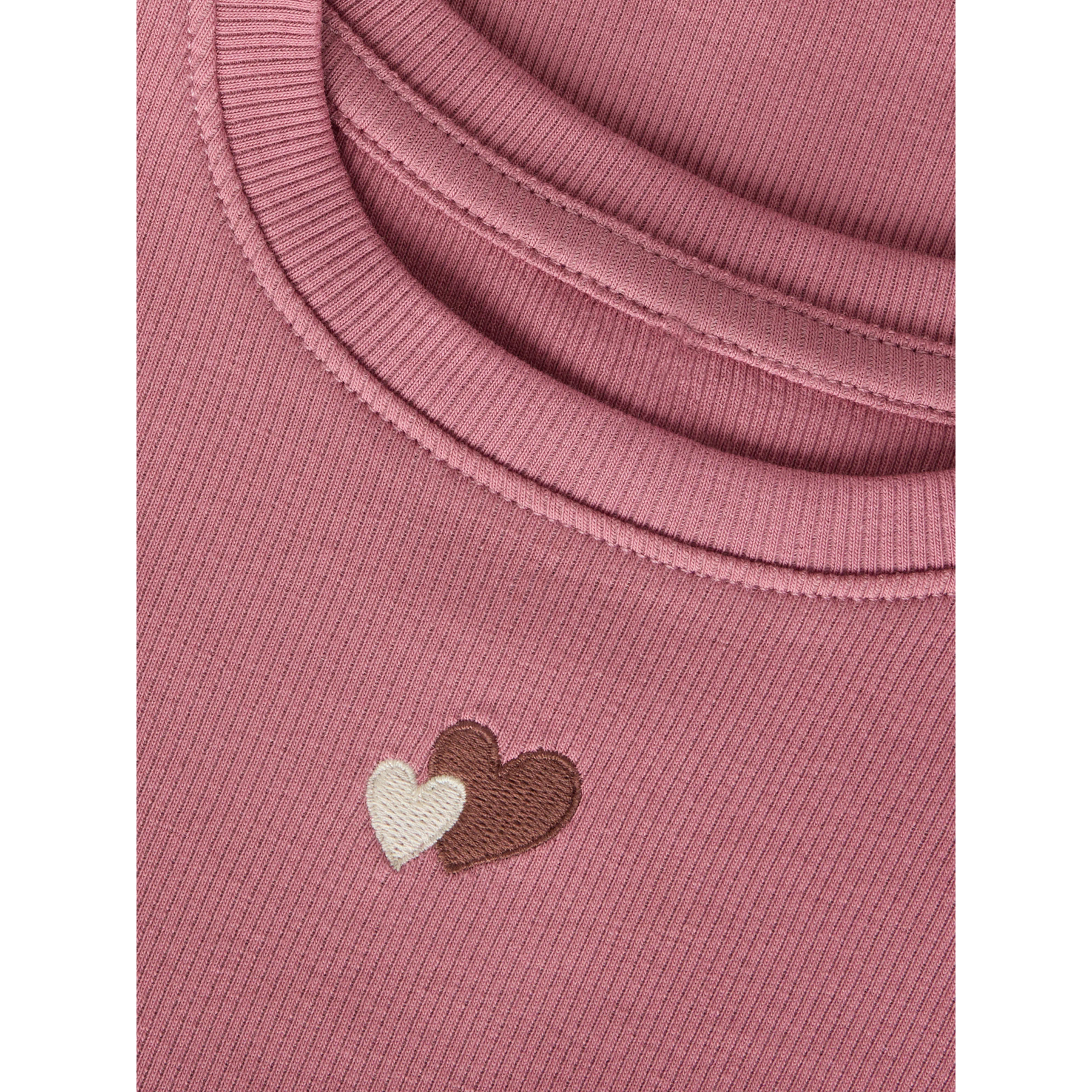 En ribstrikket top med korte ærmer og bølgede kanter, samt et fint hjerteprint på brystet. Den bløde ribkvalitet giver en behagelig og fleksibel pasform til hverdagsbrug.