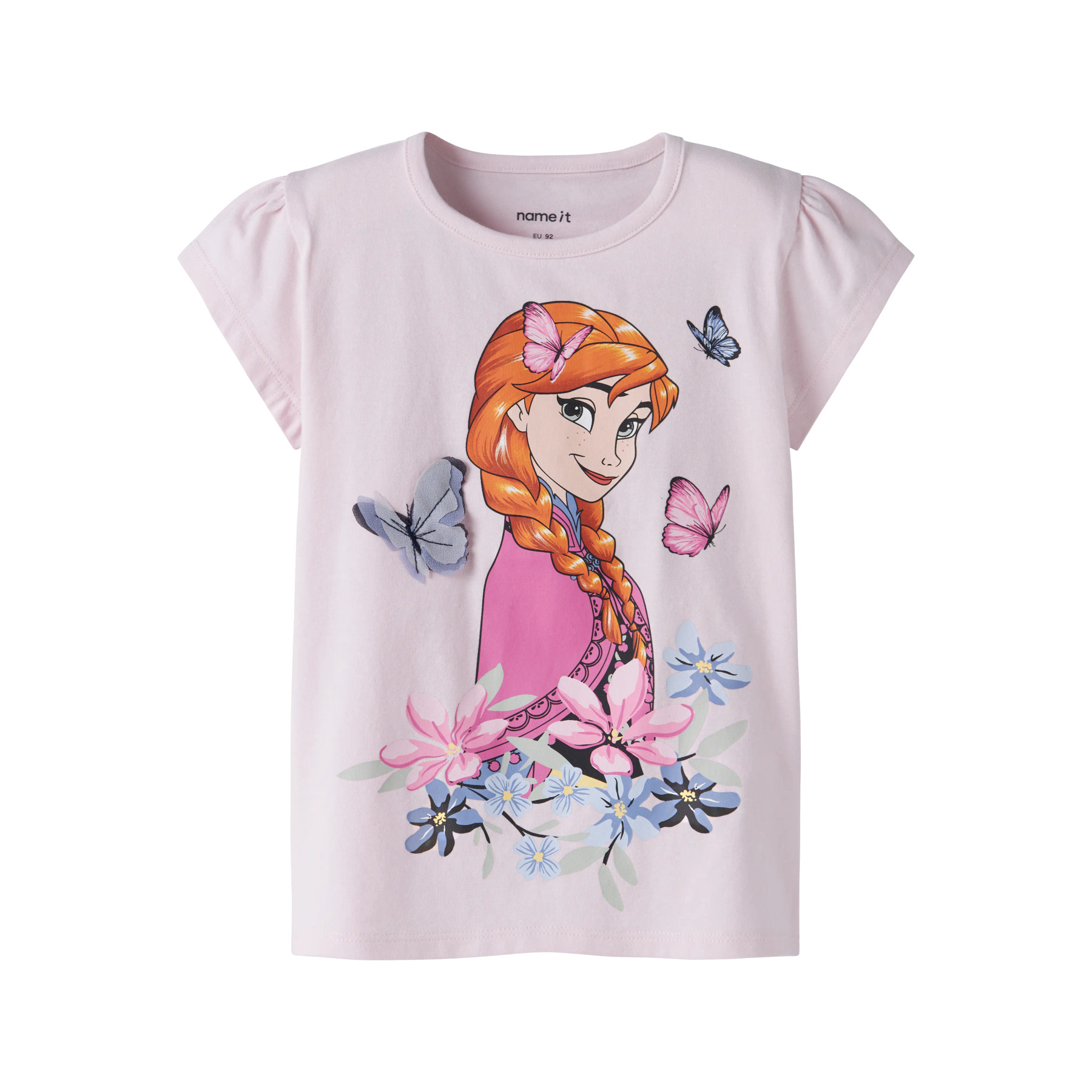 En fin T-shirt med rund hals og korte ærmer, der er let rynkede ved skuldrene. Forsiden prydes af et stort, blødt gummitryk med Disney's Anna fra Frost, omgivet af farverige blomster og sommerfugle. Fremstillet i let og strækbart jerseymateriale med en blød overflade, der sikrer god komfort og bevægelsesfrihed i en regular pasform.