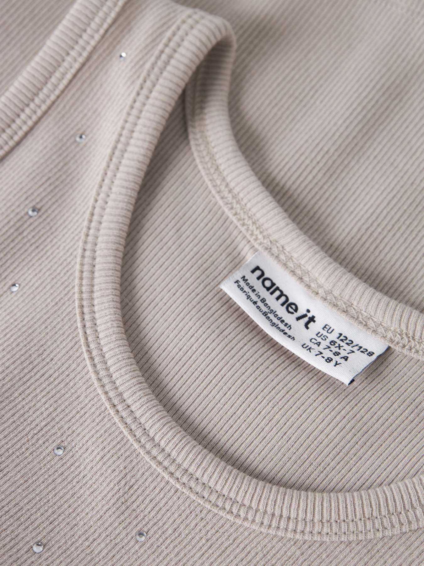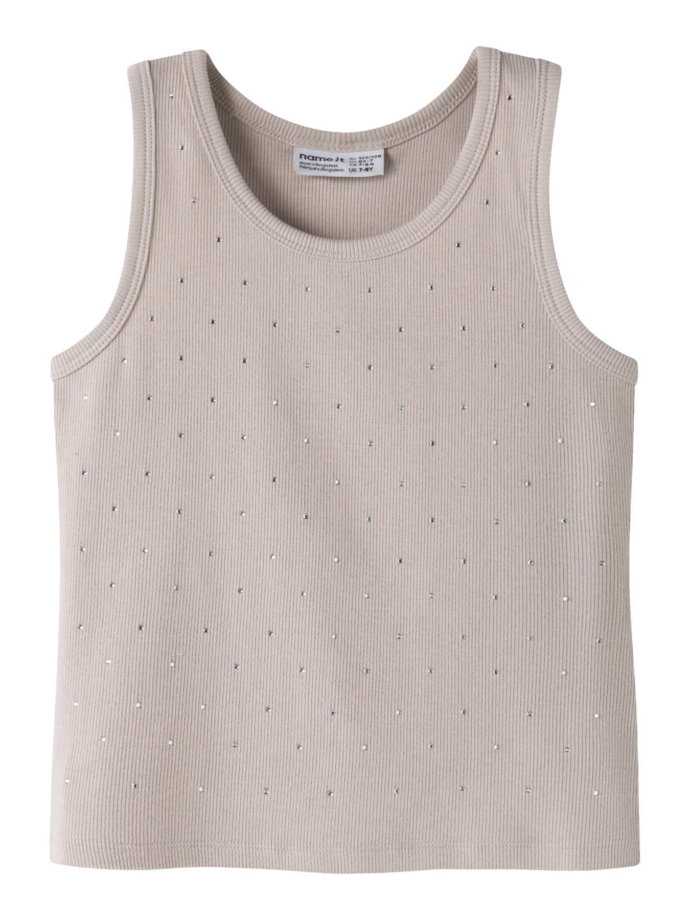 Opdater dit barns garderobe med en fin tanktop, der passer til både hverdag og særlige lejligheder. Den er lavet i ribstrik med god stræk og et tidløst look. Designet har rund hals, ærmeløs og fine rhinsten-detaljer. Slim fit pasform.