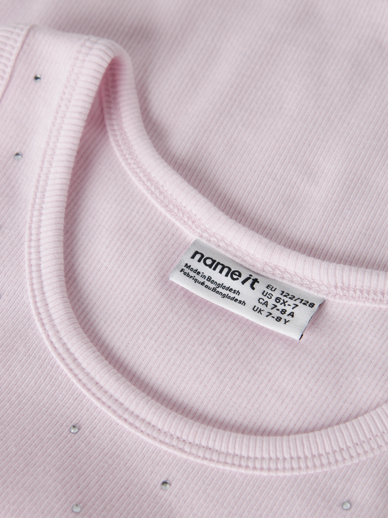 Opdater dit barns garderobe med en fin tanktop, der passer til både hverdag og særlige lejligheder. Den er lavet i ribstrik med god stræk og et tidløst look. Designet har rund hals, ærmeløs og fine rhinsten-detaljer. Slim fit pasform.