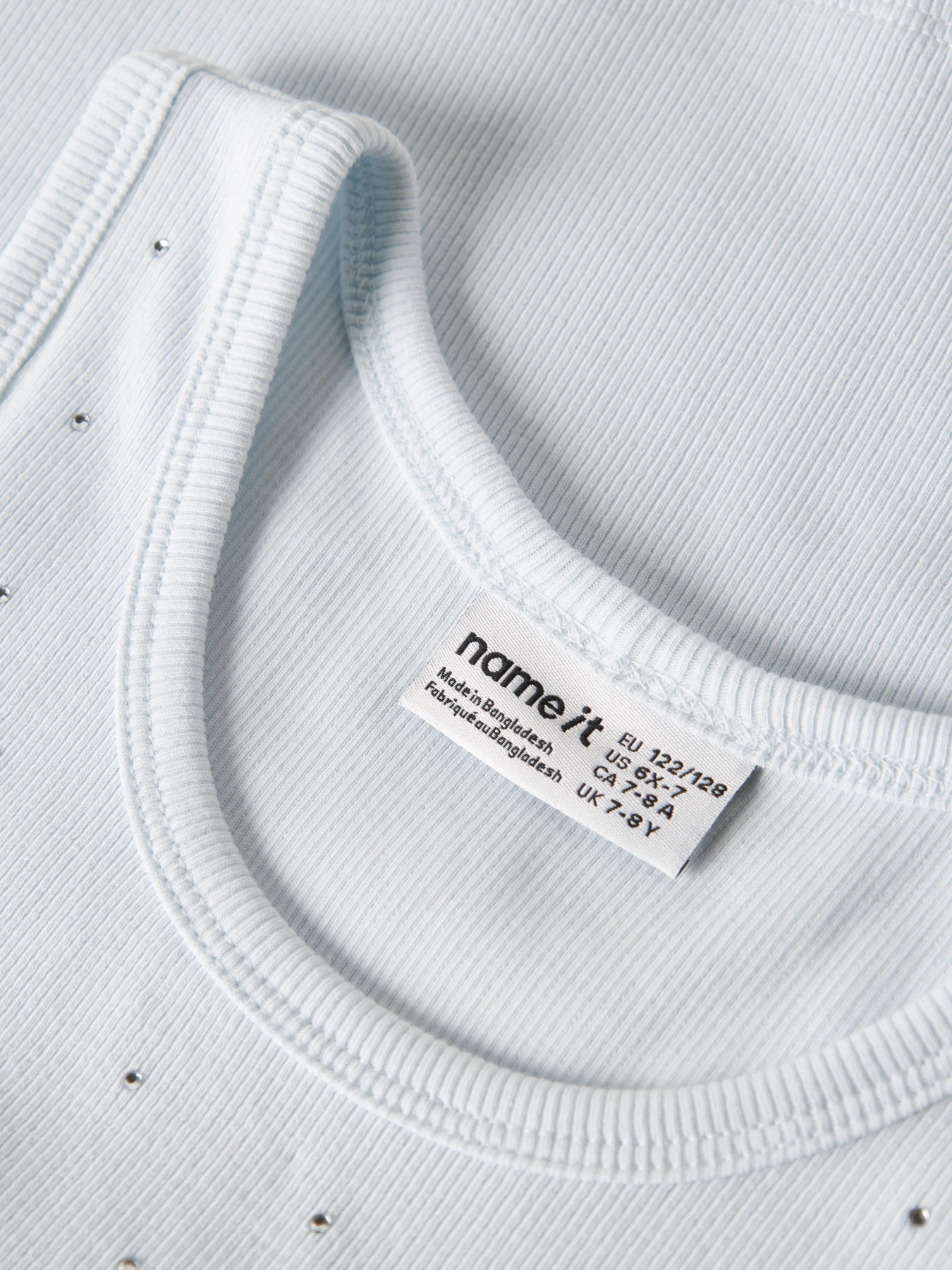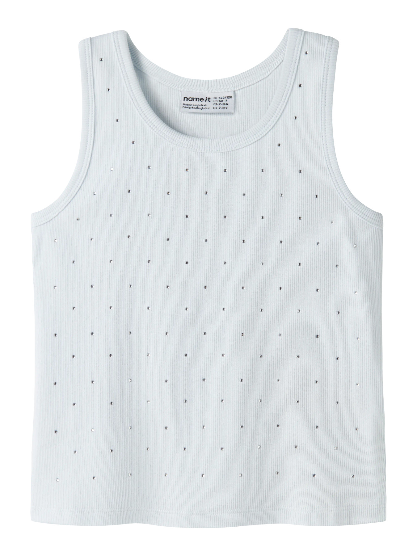 Opdater dit barns garderobe med en fin tanktop, der passer til både hverdag og særlige lejligheder. Den er lavet i ribstrik med god stræk og et tidløst look. Designet har rund hals, ærmeløs og fine rhinsten-detaljer. Slim fit pasform.