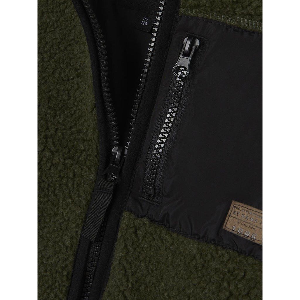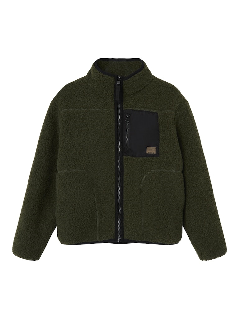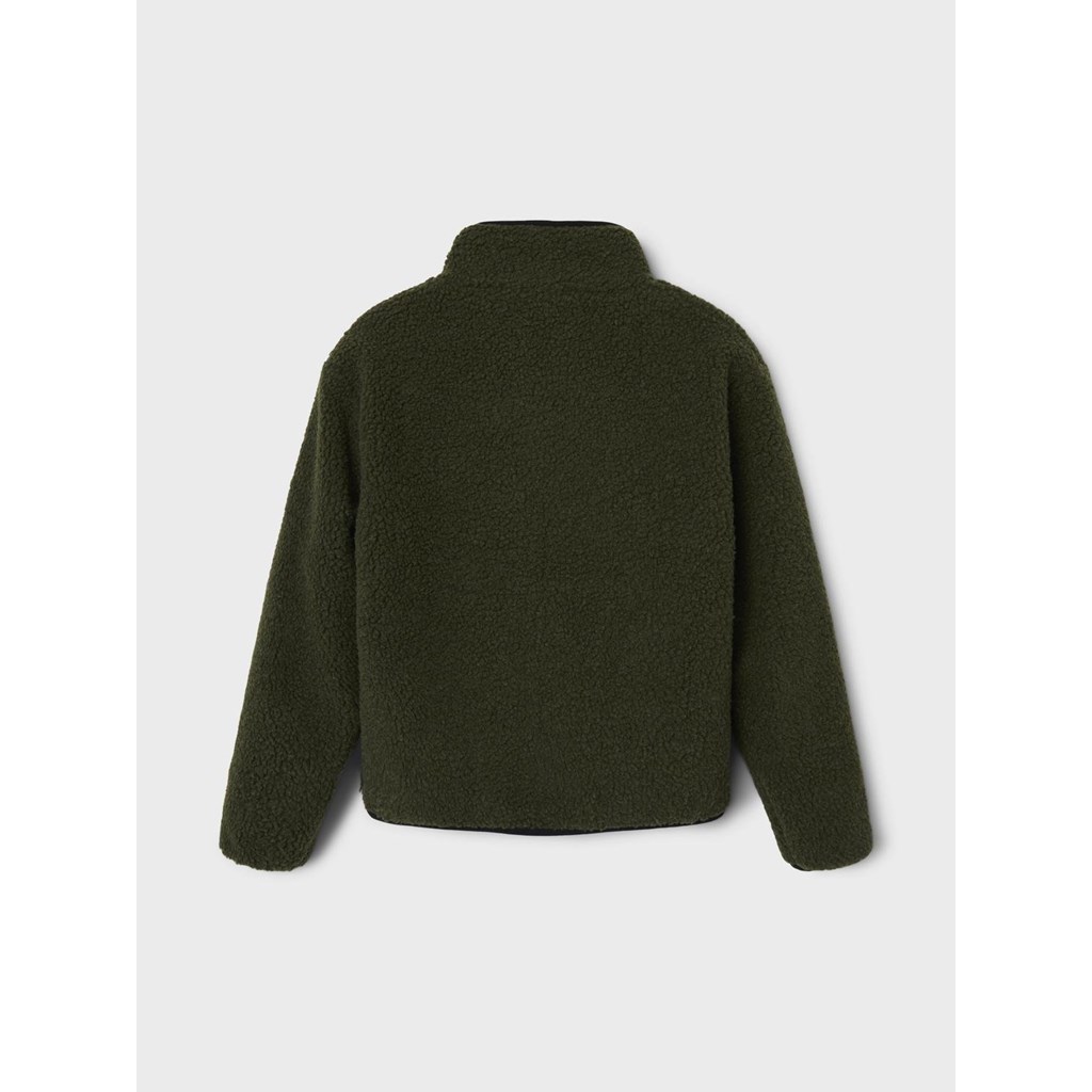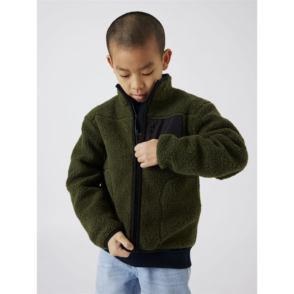 Mega fed teddy jakke fra Name it med høj krave og seje detaljer. Jakken er i en lækker grøn farve med sort lynlås og lomme foran.