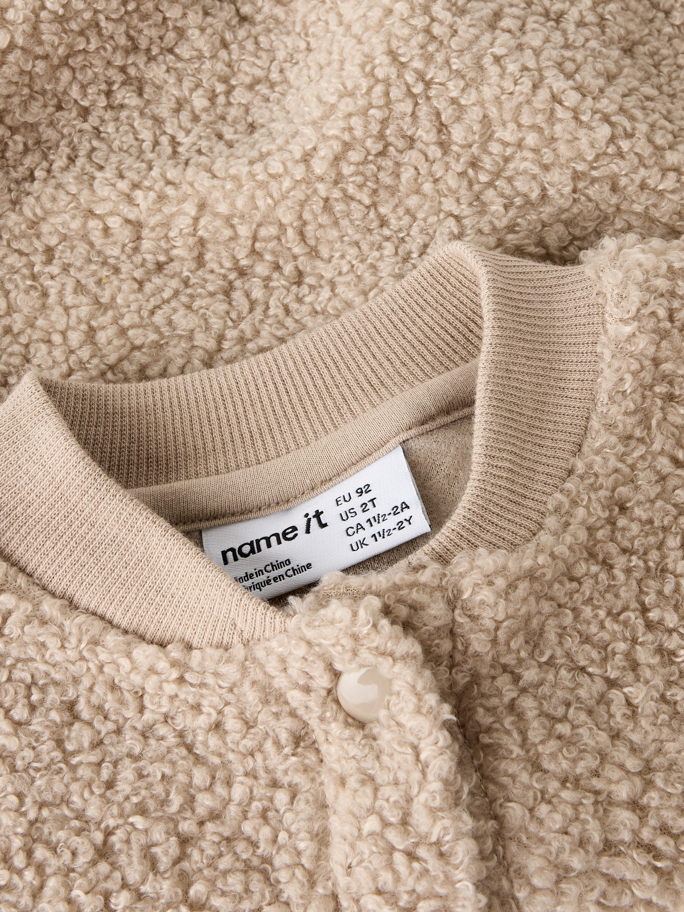 Mega lækker teddy cardigan fra Name it. Den er i mega blød kvalitet og lækkre brunlig farve. Den er med smiley detaljer på albuerne og lille elastisk krave. Den lukkes med trykknapper hele vejen ned.