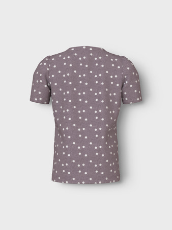 Meget sød top fra name it. Toppen er i en flot støvet lilla farve og med hvide prikker. Den har rund hals.