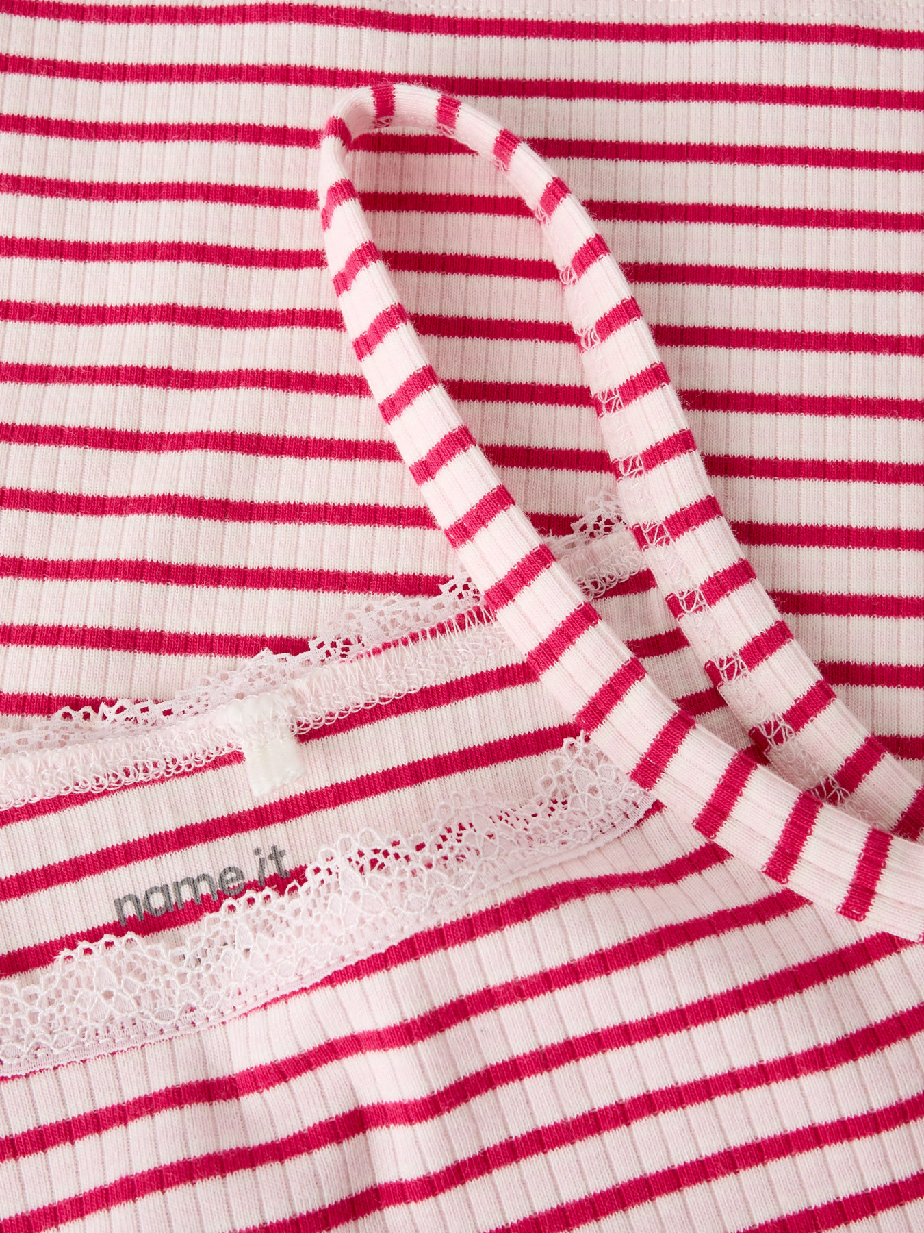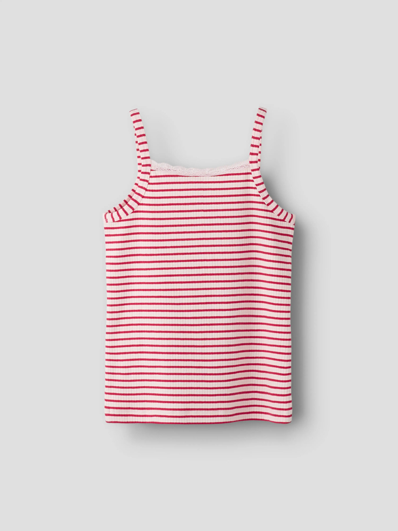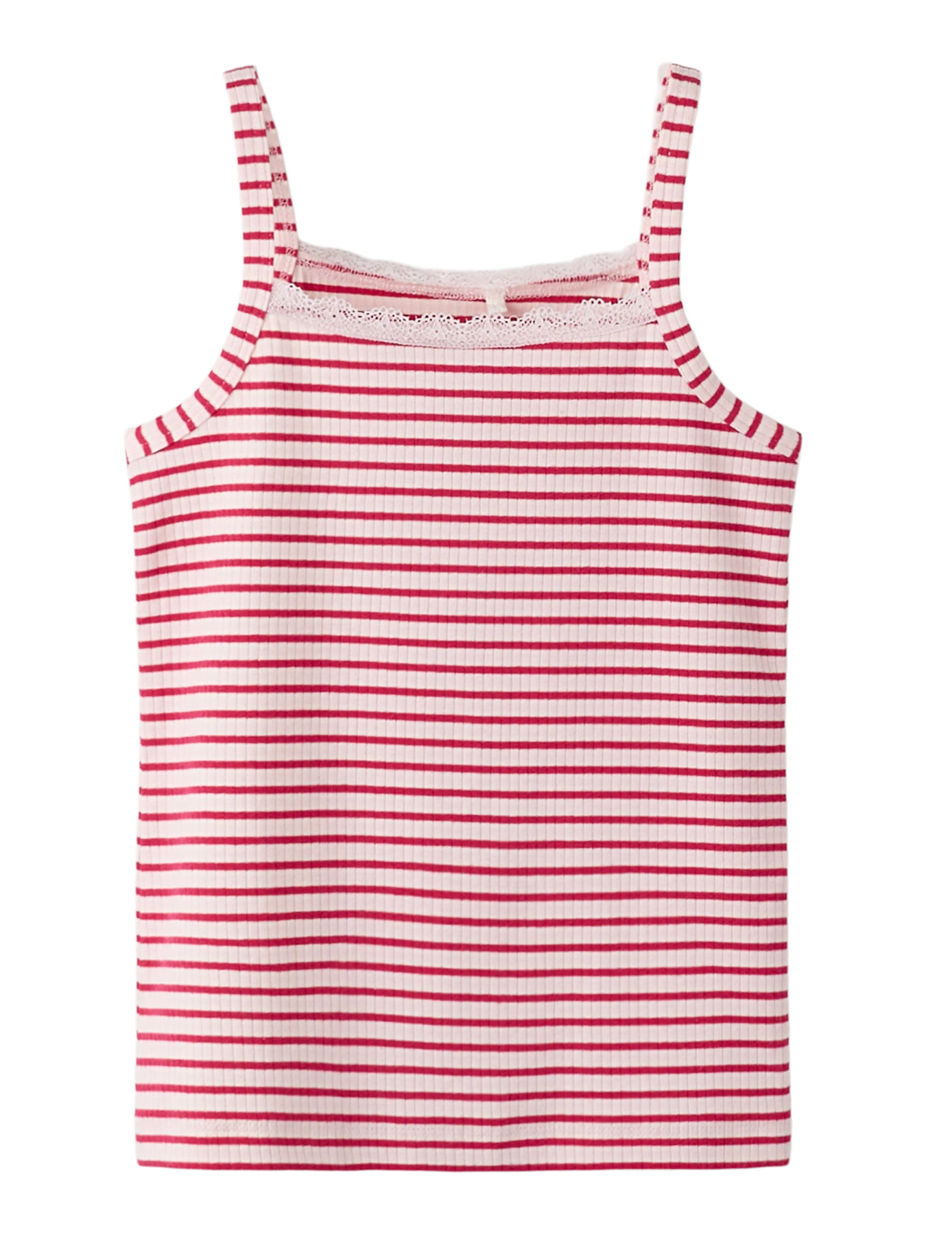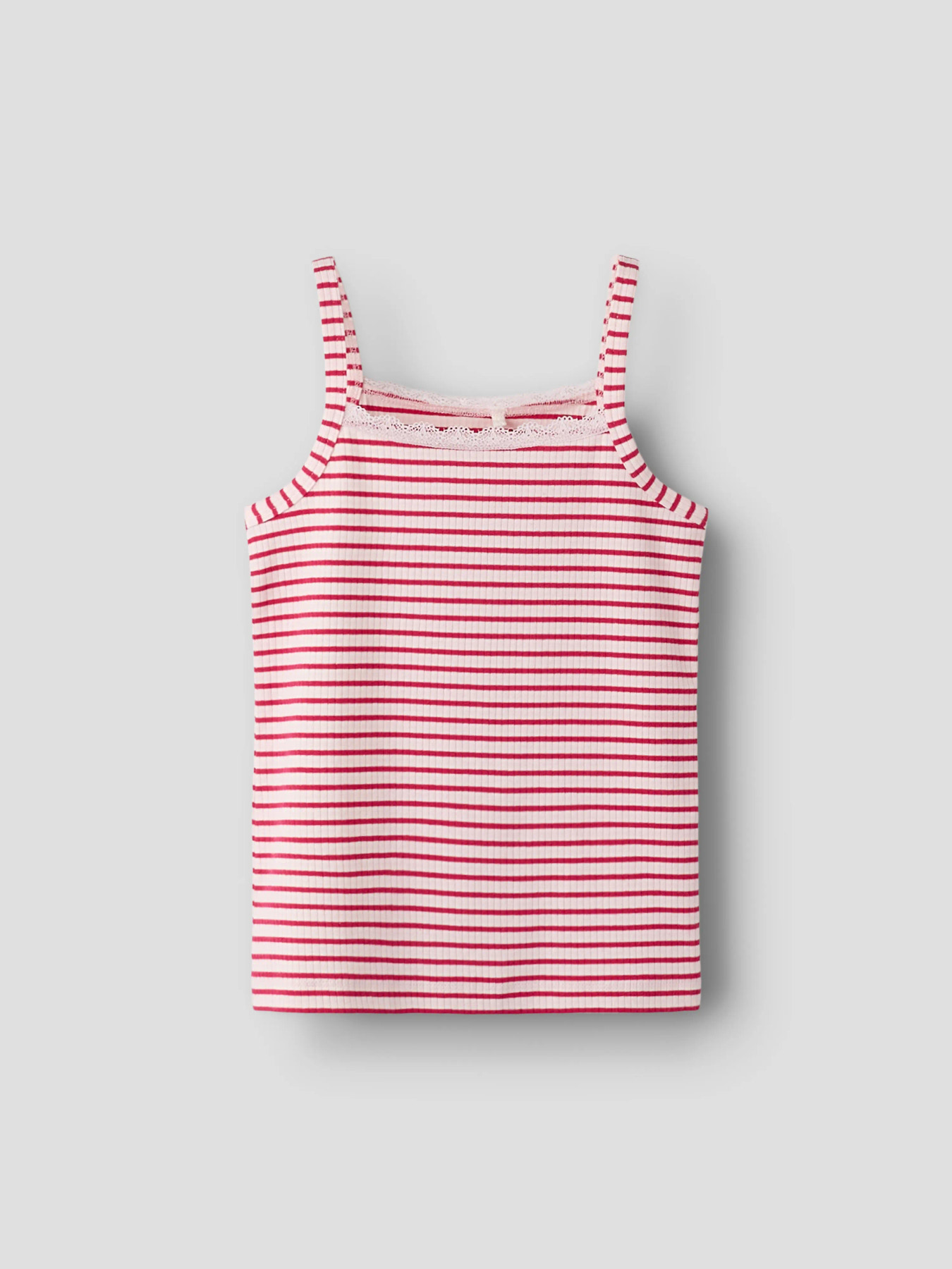 Top der er lavet i ribstrikkede kvalitet med lodret struktur giver et tidløst look og god elasticitet for optimal komfort. Toppen har firkantet udskæring, er ærmeløs og har fine blondedetaljer, der tilføjer et feminint touch. Den tætsiddende pasform fuldender det moderne udtryk.