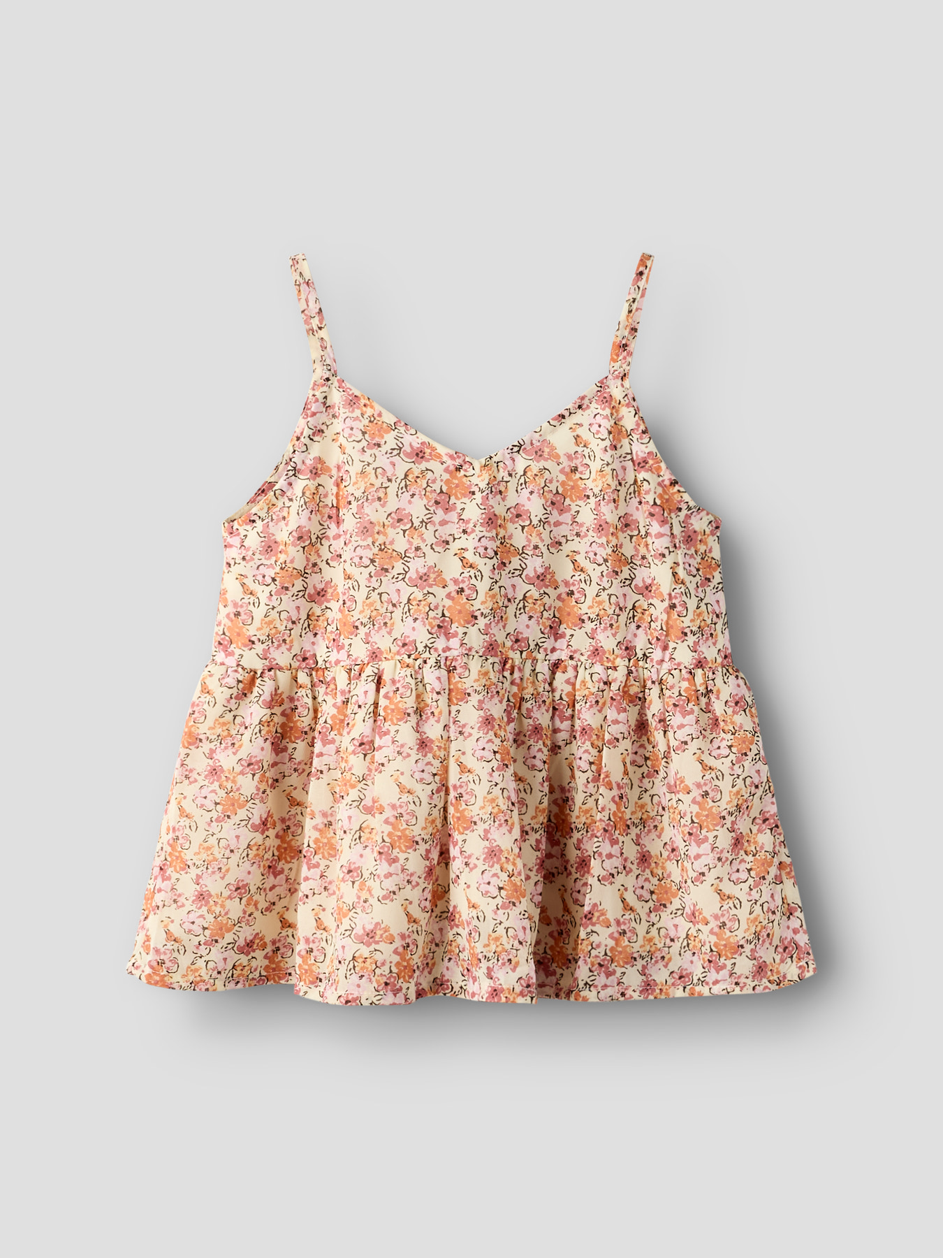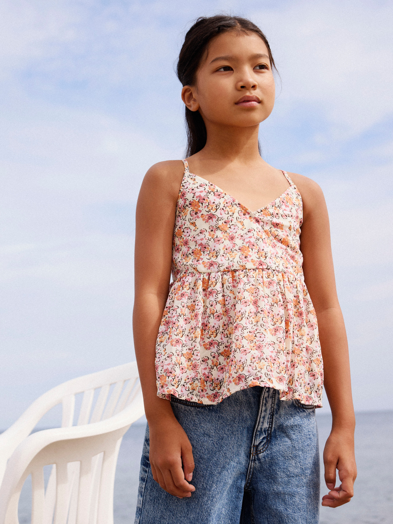 Elegant top, den er lavet i let chiffon, som er et vævet materiale med et let gennemsigtigt udtryk og en skinnende overflade, der giver et fint og feminint look. Toppen har V-udskæring, er ærmeløs og har regular fit samt et heldækkende print, der fuldender det stilfulde design.