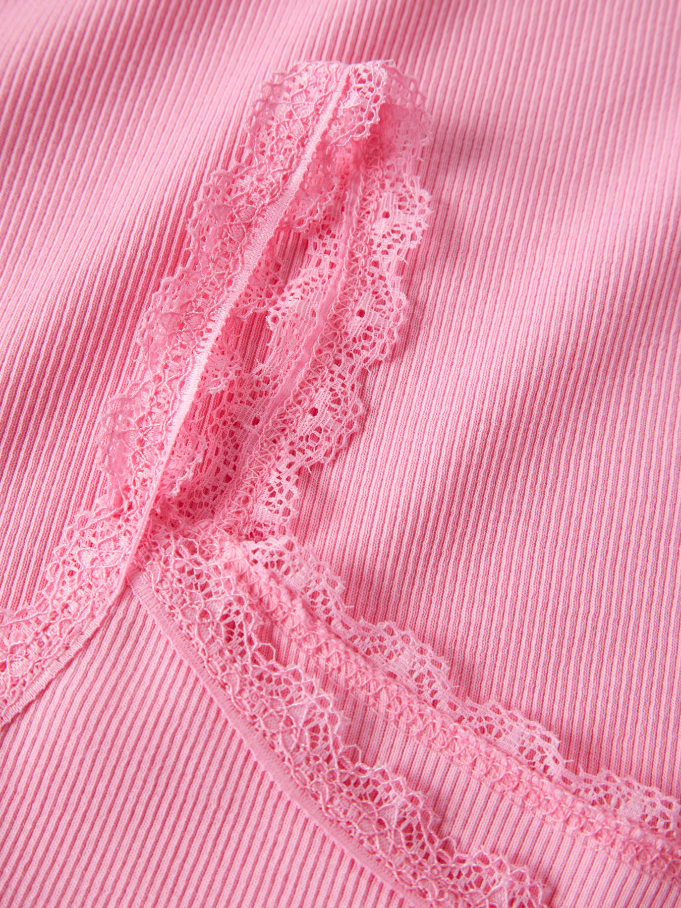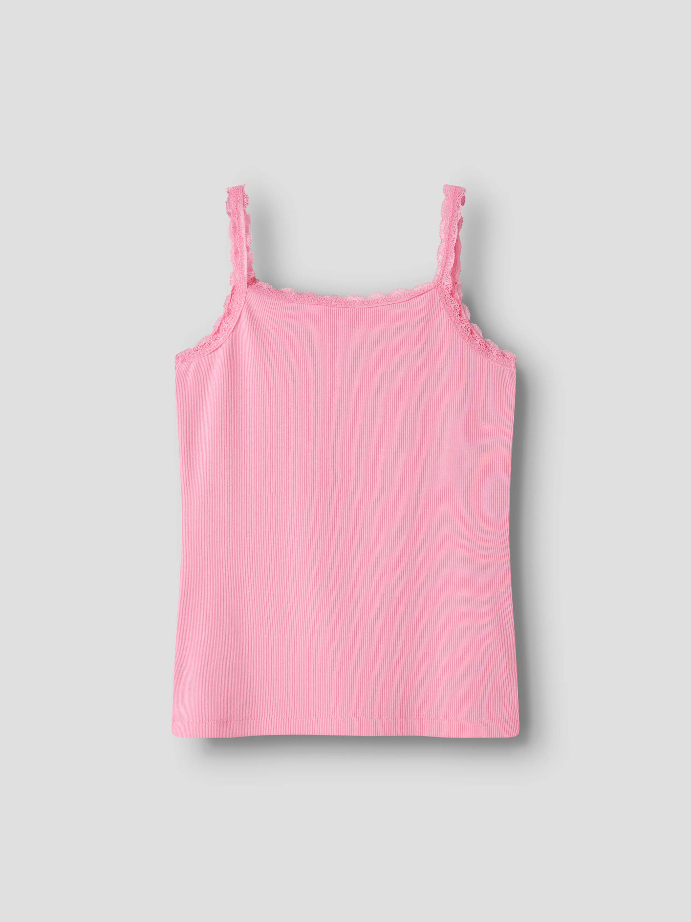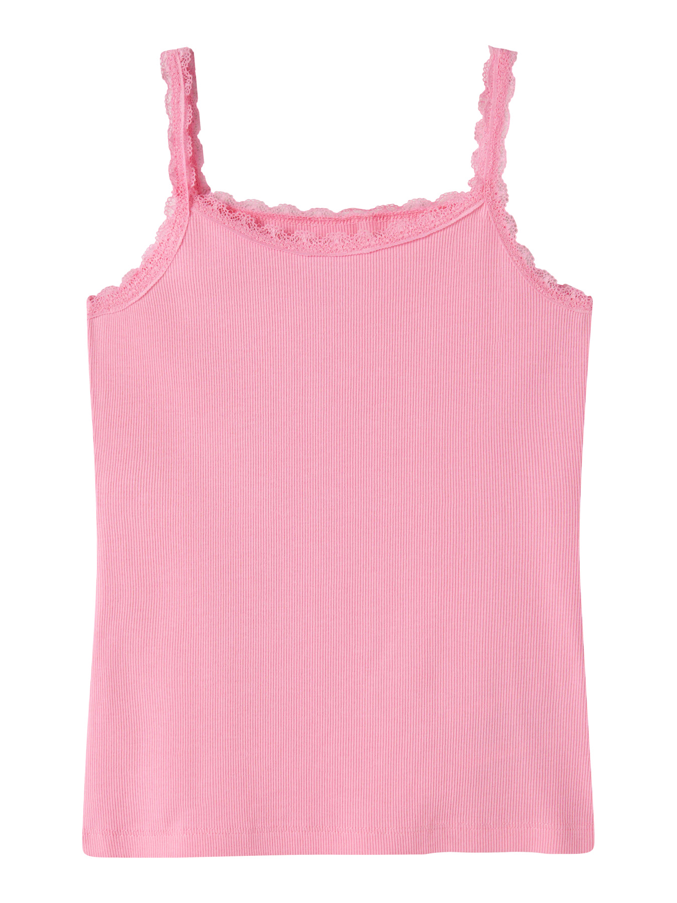 Tanktop i ribstrik med god elasticitet og et tidløst look. Den har rund hals, er ærmeløs og har fine blonde-detaljer, hvilket giver et sødt og stilfuldt touch i en tætsiddende slim fit.