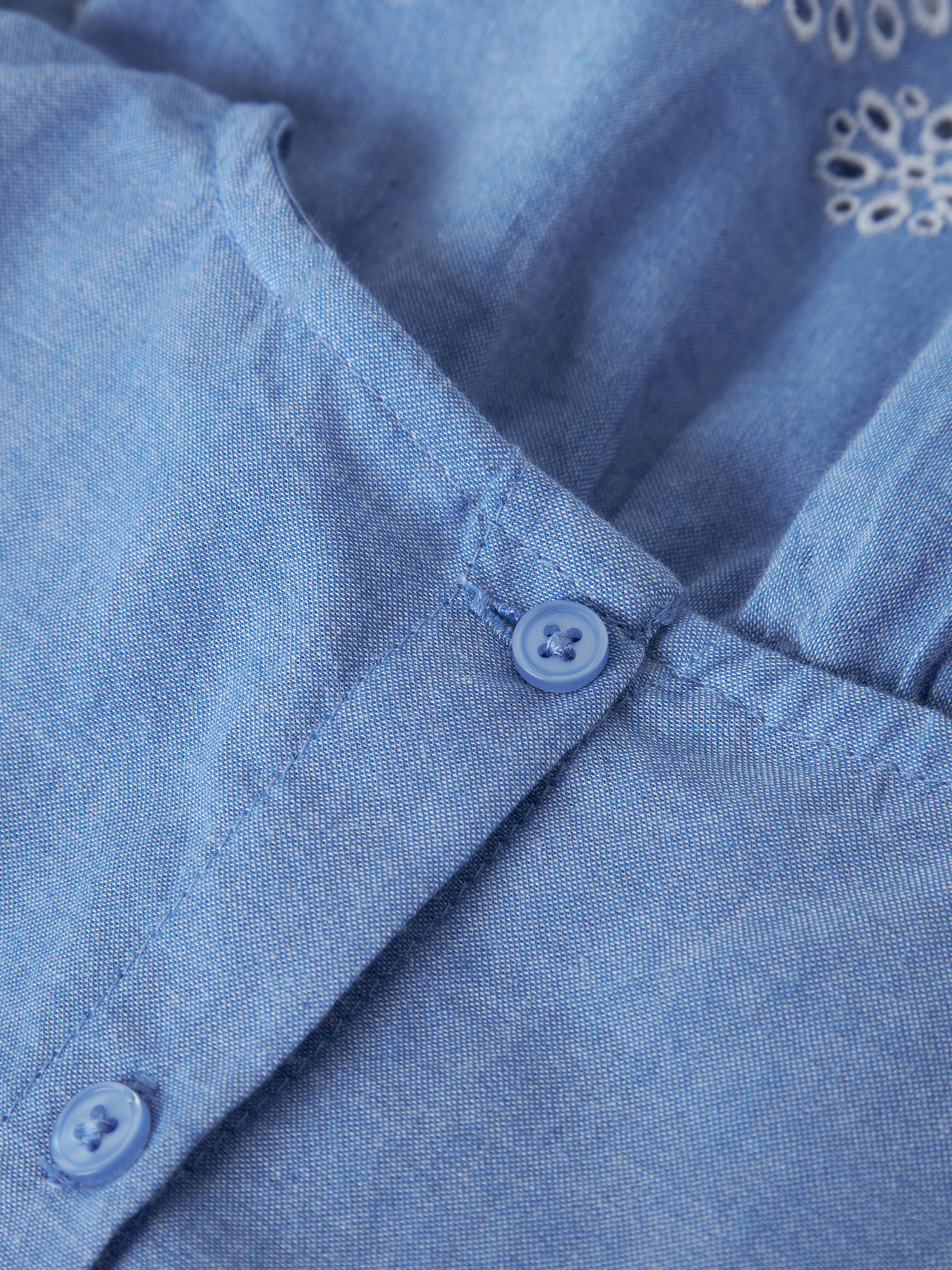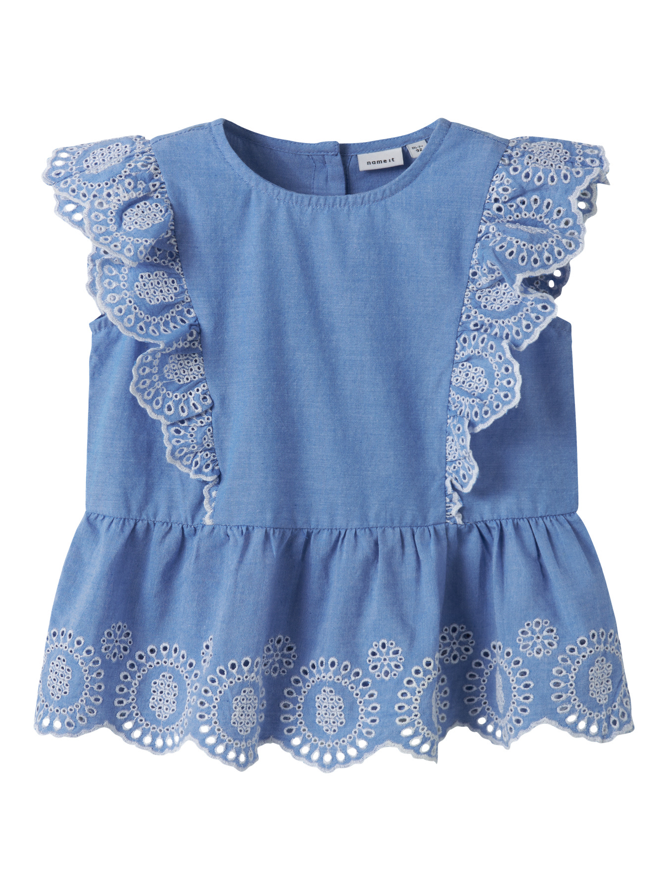 Opdater dit barns garderobe med denne fine og lette top fra Name It. Den har rund hals, korte ærmer, knaplukning samt fine broderie anglaise- og flæsedetaljer, der giver et sødt look.