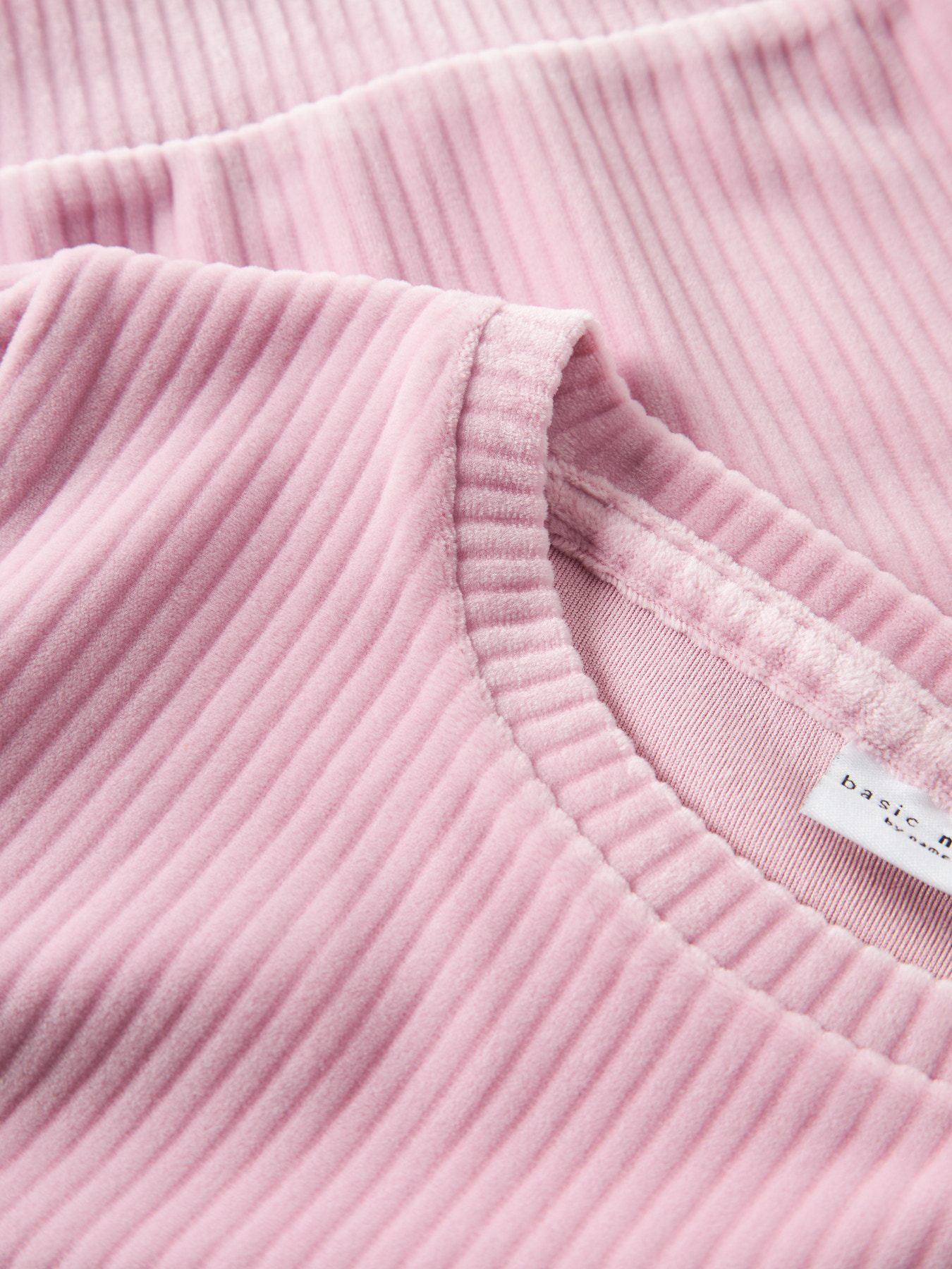 Mega blød velour bluse fra Name it. Den er med elastik kant ved ærmerne og maven. Kort model.