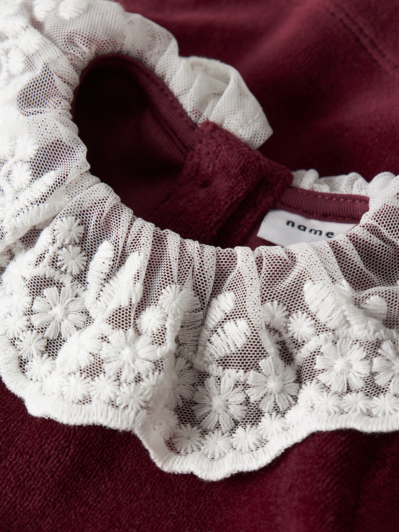 Den smukkeste kjole fra name it, den er lavet i velour i en smuk farve og med en hvid blondekrave.