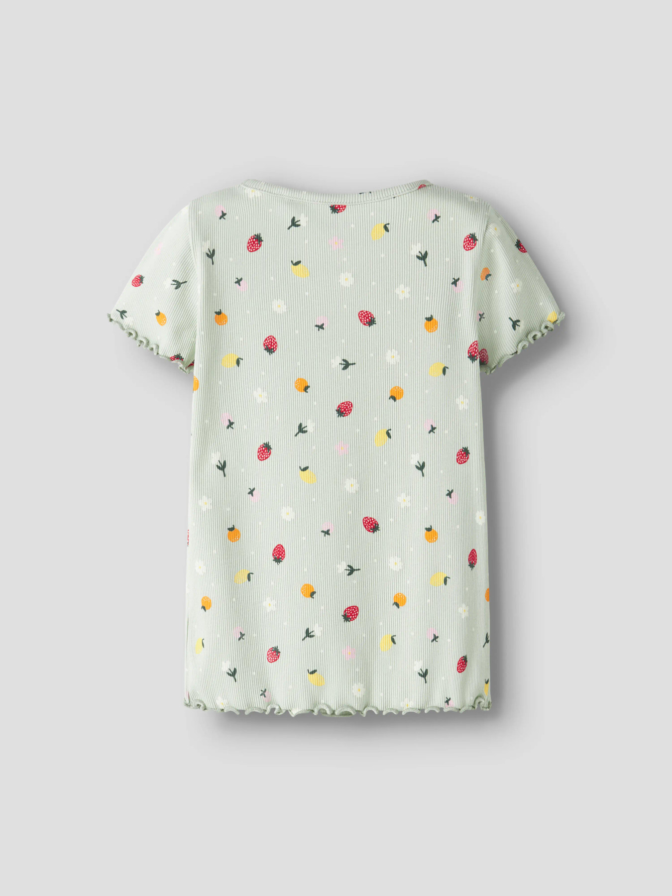 Mega lækker rib t-shirt fra Name it i et slim fit. T-shirten er med pynteknapper foran, korte ærmer og fine bølgekanter. T-shirten er i grøn med små frugter.
