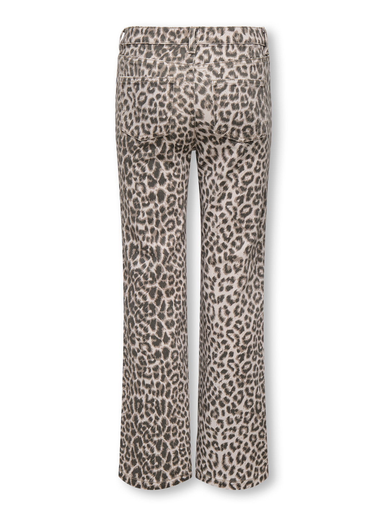 Mega seje leo jeans fra Kids Only. De er højtaljede og med brede ben. De er i "vasket" look og leo print i fine farver. De er med lommer og bæltestropper.