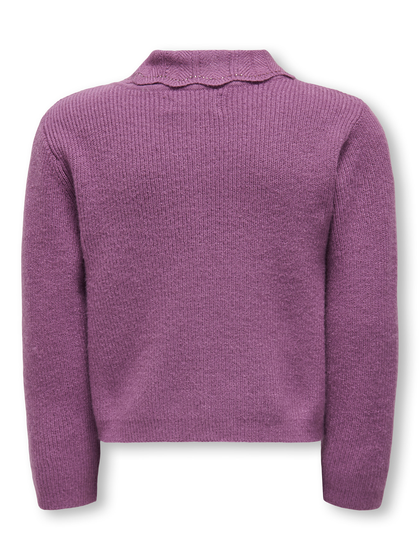 Smukkeste strik cardigan fra Kids Only. Den er i flot lilla farve, med den fineste bølgede krave med små sten indvendig. Den er i lækker blød strik og med knap lukning hele vejen ned.