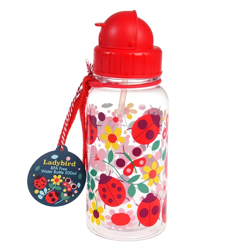 Børnevandflaske med integreret sugerør og nylonbærestrop, dekoreret med vores print af mariehøns.