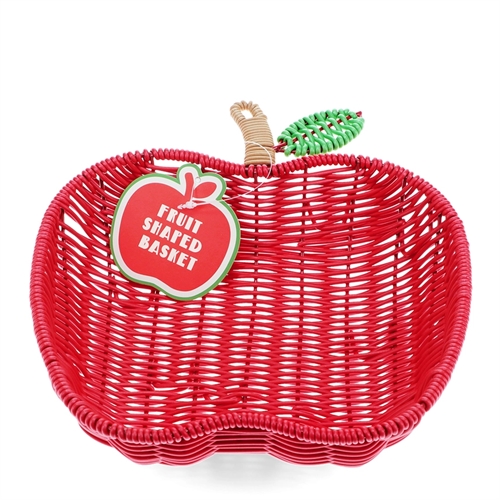 Sjov og praktisk kurv, lavet af fødevaresikker plastik, flettet omkring en robust metalramme. Med et frugtigt og sommerligt æbledesign i levende røde og grønne farver og detaljer, tilbyder den en legende og stilfuld måde at opbevare frugt, snacks eller bare små legetøjs dele på. Perfekt til at placere på en hylde, køkkenbord, midten af et spisebordet eller på børneværelset.
