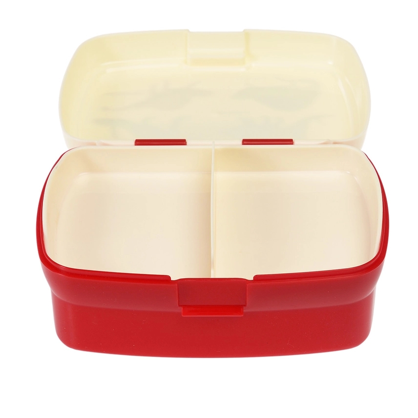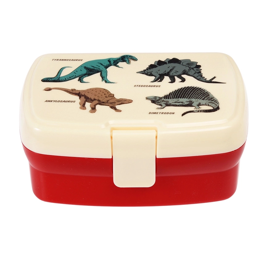 En madkasse med aftagelig bakke og hængslet låg, der har vores Prehistoric Land dinosaurprint.