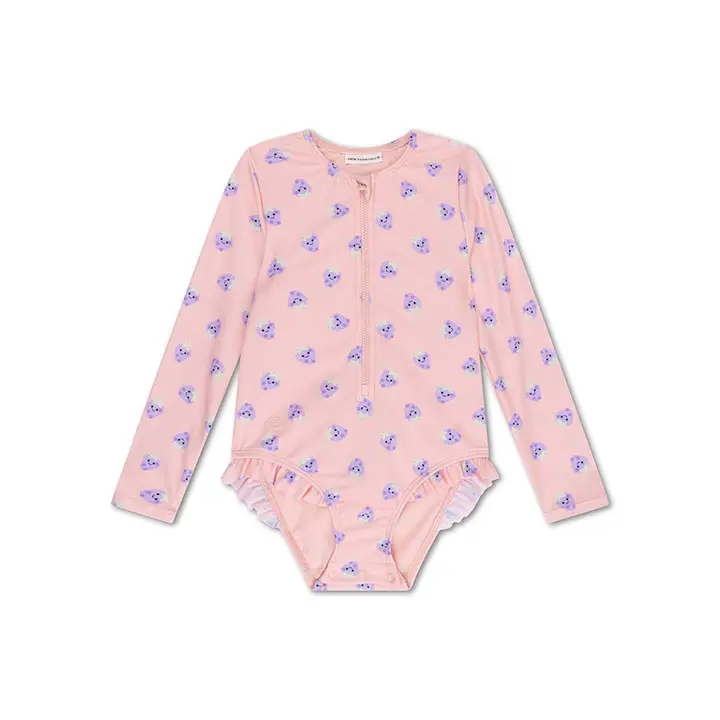 UV-badedragt til piger i et frisk pink og lilla brombærprint, lavet af genbrugt strækstof med UPF50+ beskyttelse til stilfuld og ubekymret sommersjov.