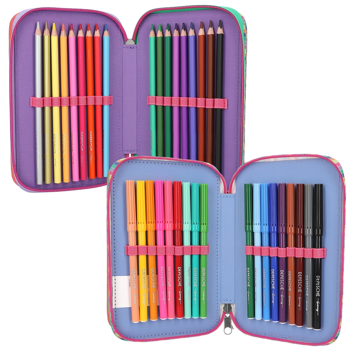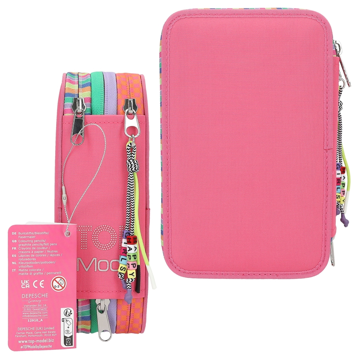 Et rummeligt penalhus i flot pink med motiv af TOPModellerne Lizzy, Fergie og Jill og med supersmarte, farvede og mønstrede detaljer. Penalhuset er opdelt i tre rum og fyldt med alt, hvad man skal bruge til at tegne og skrive med i skolen og derhjemme. Indeholder bl.a. saks, lineal, viskelæder, blyantspidser, 2 blyanter, 18 farveblyanter og 18 tuscher og meget mere. Penalhuset har desuden et farverigt lynlåsvedhæng med snore og perler med ordlyden "HAPPY GIRLS".