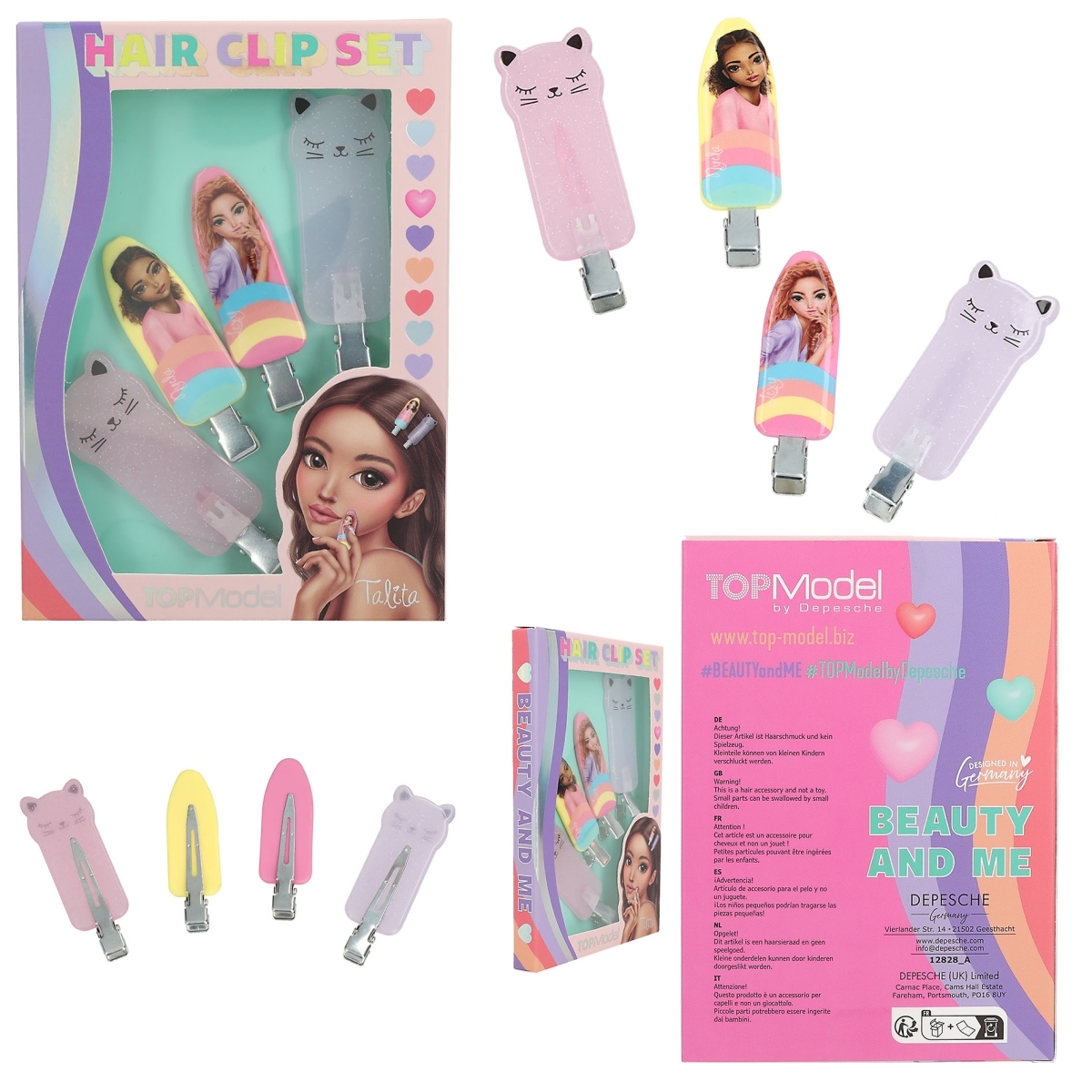 Disse fine hårspændesæt fra TOPModel Beauty and me serien fås i to forskellige varianter, hvert sæt med fire forskellige hårspænder. Det ene sæt er med sølvfarvede metalklips, to med TOPModelmotiver i gul og pink samt to med kattemotiv i semitransparent hvid og pink med glitter. Det andet sæt er med gyldne metalklips, to TOPModelmotiver i lilla og orange samt to klips med pandaer i semitransparent abrikos og pink med glitter.