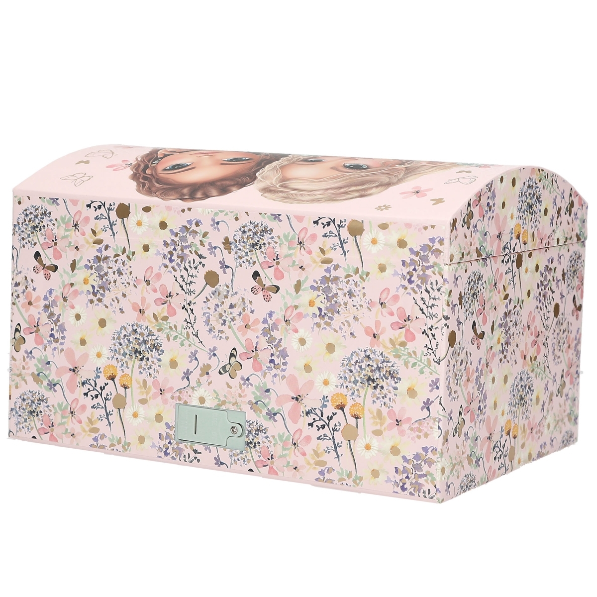Gem dine smykker og andre små skatte i dette smykkeskrin i superfint TOPModel SUMMER FEELING design i svag rosa og salviegrøn med masser af blomster og sommerfugle og motiv af TOPModellerne Hayden og June. Smykkeskrinet har to skuffer og et stort rum med flytbar bakke til alle dine yndlingssmykker. Smykkeskrinet er desuden udstyret med sikker kodelås, som du selv kan vælge. Når koden er indtastet korrekt, spiller melodien Shivers, hvilket er mega-cool men samtidig også en ekstra sikkerhedsforanstaltning til at afsløre eventuelle "ubudne gæster". Batterier er inkluderet og kan udskiftes.